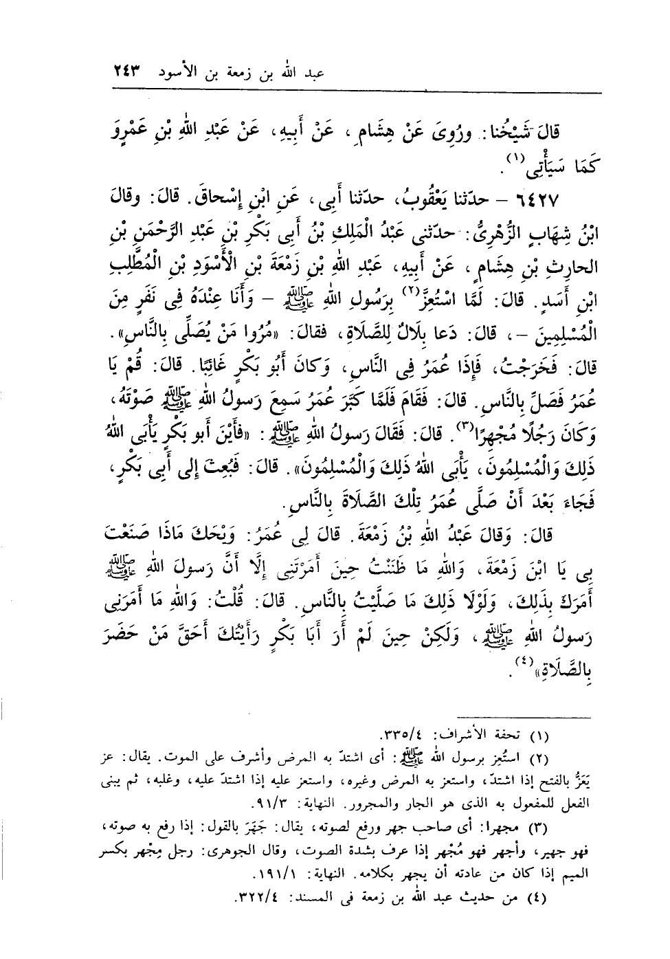 6427 - حدثنا يعقوب، حدثنا أبى، عن ابن إسحاق. قال: وقال ابن شهاب الزهرى: حدثنى عبد الملك بن أبى بكر بن عبد الرحمن بن الحارث بن هشام، عن أبيه، عبد الله بن زمعة بن الأسود بن المطلب ابن أسد. قال: لما استعز (¬1) برسول الله - صلى الله عليه وسلم - ـ وأنا عنده فى نفر من المسلمين ـ، قال: دعا بلال للصلاة، فقال: «مُرُوا مَنْ يُصَلِّى بِالنَّاس» . قال: فخرجت، فإذا عمر فى الناس، وكان أبو بكر غائبًا. قال: قم يا عمر فصل بالناس. قال: فقام فلما كبر عمر سمع رسول الله - صلى الله عليه وسلم - صوته، وكان رجلاً مجهرًا (¬2) . قال: فقال رسول الله - صلى الله عليه وسلم -: «فأَيْنَ أَبو بَكْرٍ يَأْبَى اللهُ ذَلِكَ وَالْمُسْلِمُونَ، يَأْبَى اللهُ ذَلِكَ وَالْمُسْلِمُونَ» . قال: فبعث إلى أبى بكر، فجاء بعد أن صلى عمر تلك الصلاة بالناس.
