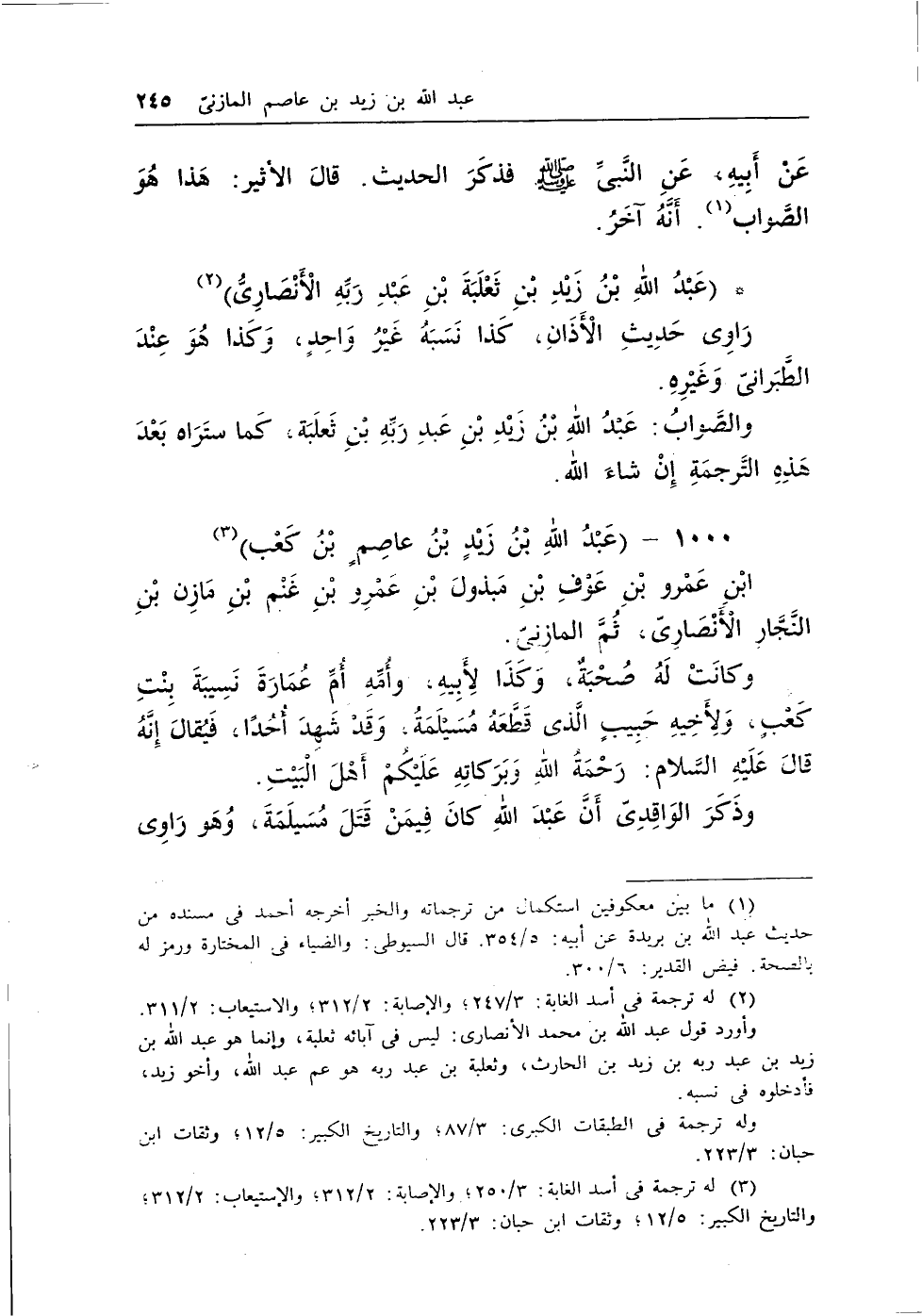 (¬1) له ترجمة فى أسد الغابة: 3/247؛ والإصابة: 2/312؛ والاستيعاب: 2/311. وأورد قول عبد الله بن محمد الأنصارى: ليس فى آبائه ثعلبة، وإنما هو عبد الله بن زيد بن عبد ربه بن زيد بن الحارث، وثعلبة بن عبد ربه هو عم عبد الله، وأخو زيد، فأدخلوه فى نسبه.