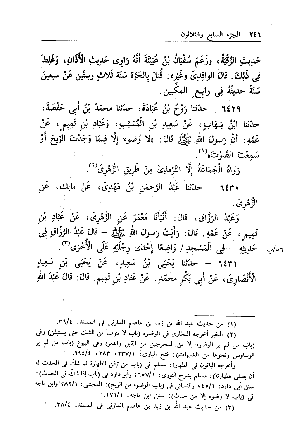 (¬2) الخبر أخرجه البخارى فى الوضوء (باب لا يتوضأ من الشك حتى يستقن) وفى (باب من لم ير الوضوء إلا من المخرجين من القبل والدبر) وفى البيوع (باب من لم ير الوساوس ونحوها من الشبهات) : فتح البارى: 1/237، 283، 4/294.