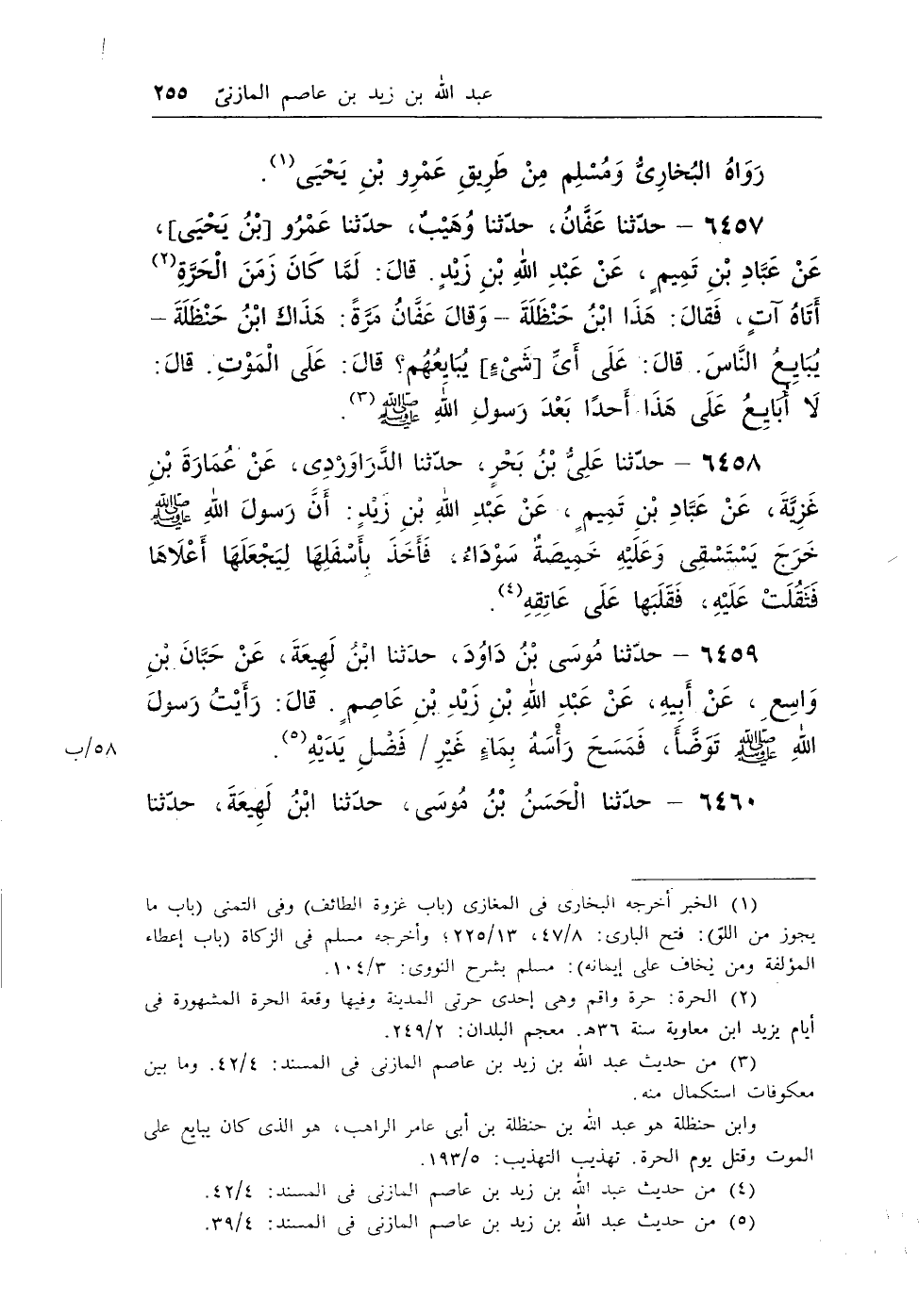 (¬2) من حديث عبد الله بن زيد بن عاصم المازنى فى المسند: 4/42. وما بين معكوفات استكمال منه. وابن حنظلة هو عبد الله بن حنظلة بن أبى عامر الراهب، هو الذى كان يبايع على الموت وقتل يوم الحرة. تهذيب التهذيب: 5/193.