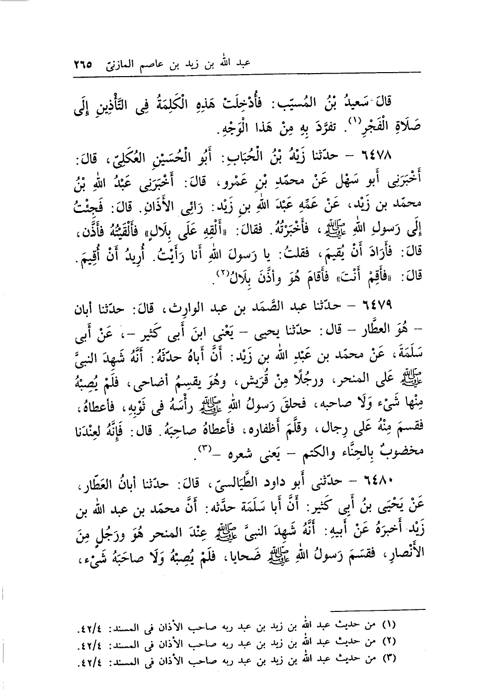 6480 - حدثنى أبو داود الطيالسى، قال: حدثنا أبان العطار، عن يحيى بن أبى كثير: أن أبا سلمة حدثه: أن محمد بن عبد الله بن زيد أخبره عن أبيه: أنه شهد النبى - صلى الله عليه وسلم - عند المنحر هو ورجل من الأنصار، فقسم رسول الله - صلى الله عليه وسلم - ضحايا، فلم يصبه ولا صاحبه شىء،