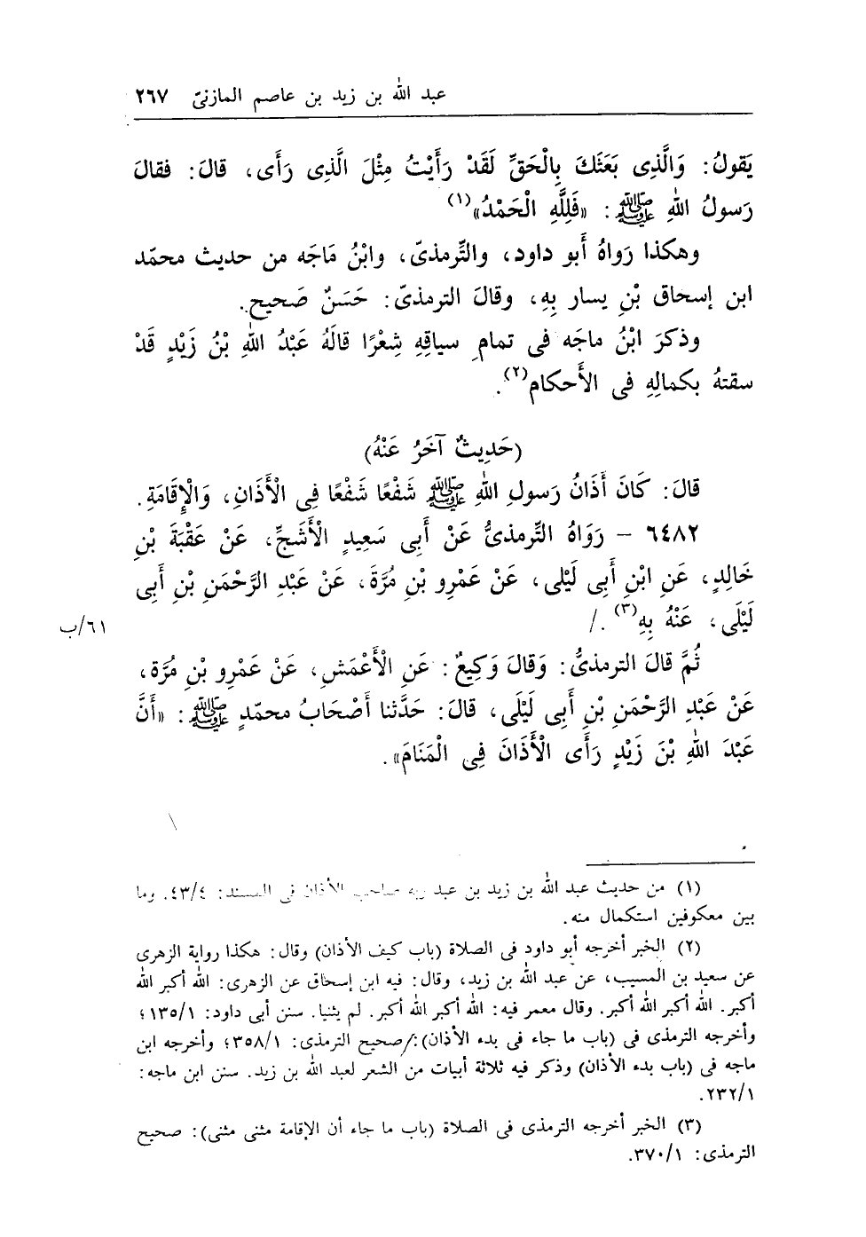 ثم قال الترمذى: وقال وكيع: عن الأعمش، عن عمرو بن مرة، عن عبد الرحمن بن أبى ليلى، قال: حدثنا أصحاب محمد - صلى الله عليه وسلم -: «أَن عبد الله بن زيد رأى الأذان فى المنام» .