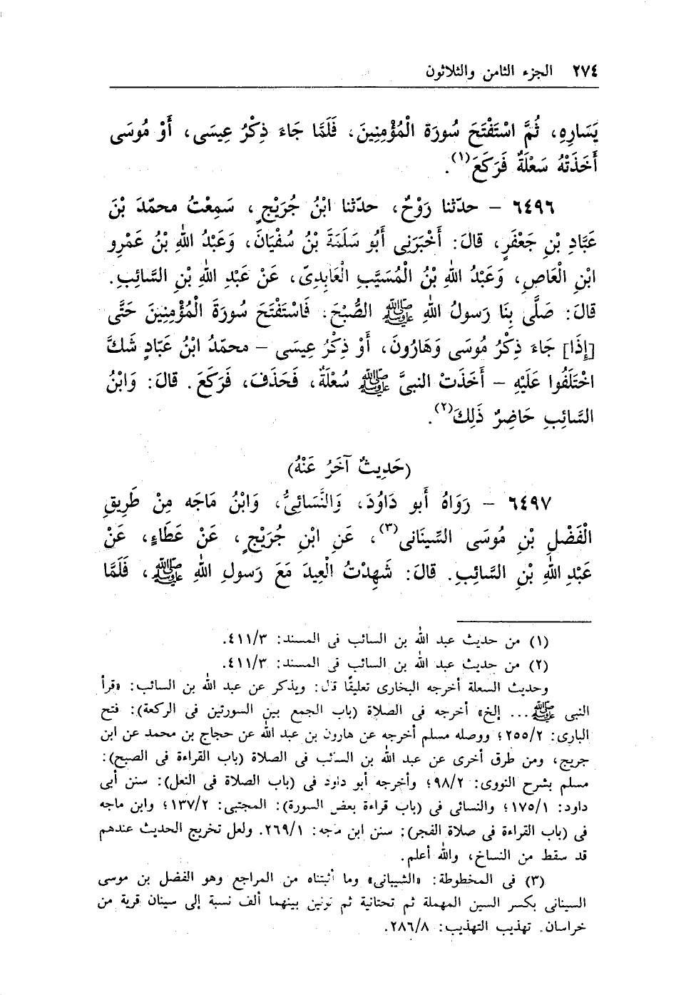 6496 - حدثنا روح، حدثنا ابن جريجٍ، سمعت محمد بن عباد بن جعفر، قال: أخبرنى أبو سلمة بن سفيان، وعبد الله بن عمرو ابن العاص، وعبد الله بن المسيب العابدى، عن عبد الله بن السائب. قال: صلى بنا رسول الله - صلى الله عليه وسلم - الصبح، فاستفتح سورة المؤمنين حتى [إذا] جاء ذكر موسى وهارون، أو ذكر عيسى ـ محمد ابن عباد شك اختلفوا عليه ـ أخذت النبى - صلى الله عليه وسلم - سعلة، فحذف، فركع. قال: وابن السائب حاضر ذلك (¬1) .