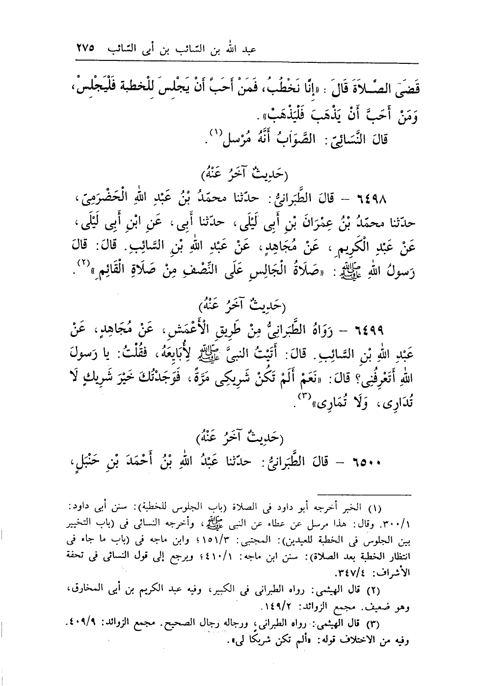 6498 - قال الطبرانى: حدثنا محمد بن عبد الله الحضرمى، حدثنا محمد بن عمران بن أبى ليلى، حدثنا أبى، عن ابن أبى ليلى، عن عبد الكريم، عن مجاهد، عن عبد الله بن السائب. قال: قال رسول الله - صلى الله عليه وسلم -: «صَلاَةُ الْجَالِس عَلَى النِّصْفِ مِنْ صَلاَةِ الْقَائِمِ» (¬1) .