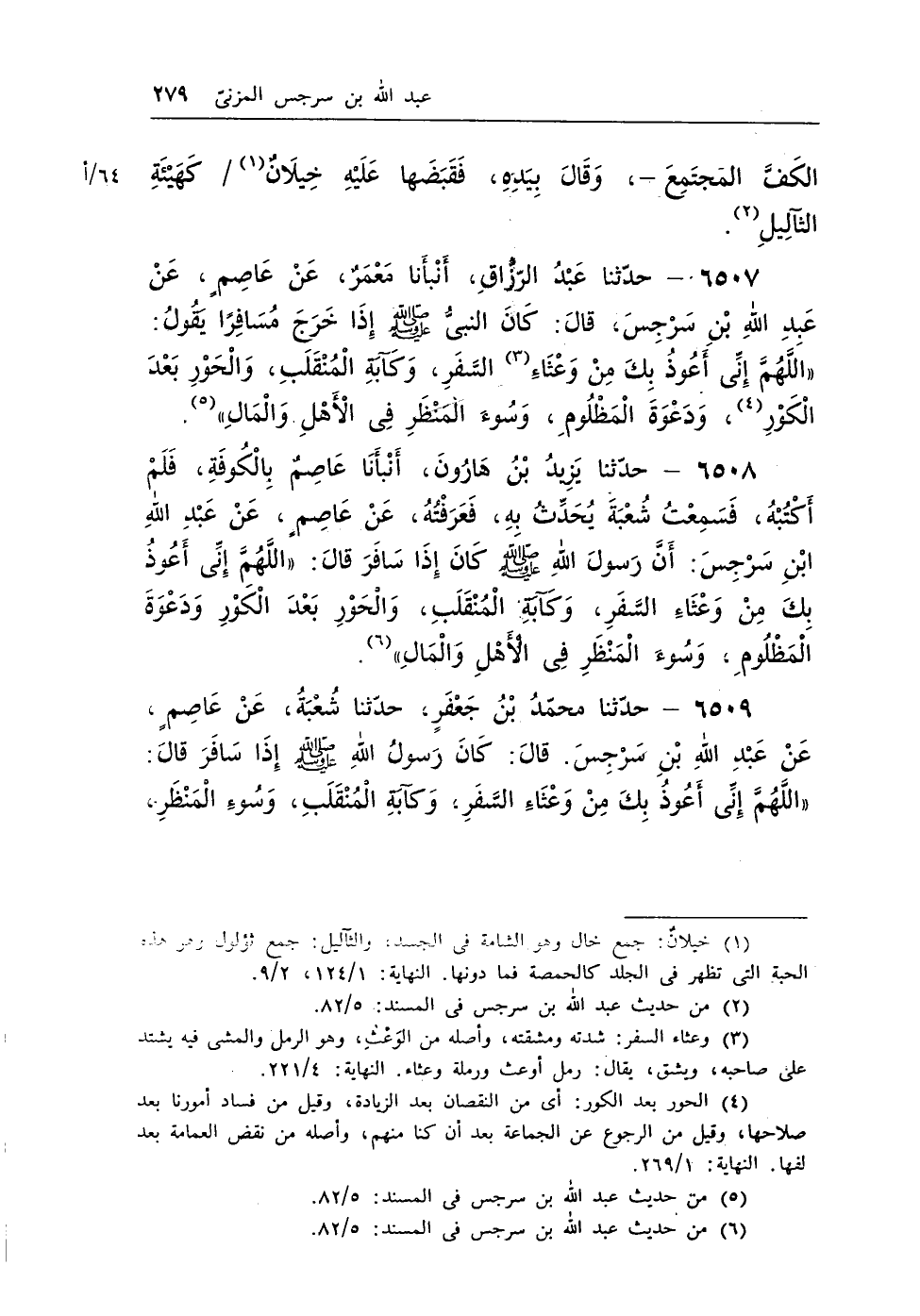 6508 - حدثنا يزيد بن هارون، أنبأنا عاصم بالكوفة، فلم أكتبه، فسمعت شعبة يحدث به، فعرفته، عن عاصم، عن عبد الله بن سرجس: أن رسول الله - صلى الله عليه وسلم - كان إذا سافر قال:: «اللَّهُمَّ إِنِّى أَعُوذُ بِكَ مِنْ وَعْثَاءِ السَّفَرِ، وَكَآبَةِ الْمُنْقَلَبِ، وَالْحَوْرِ بَعْدَ الْكَوْرِ، وَدَعْوَةَ الْمَظْلُومِ، وَسُوءَ المَنْظَرِ فِى الأَهْلِ وَالْمَالِ» (¬4) .
