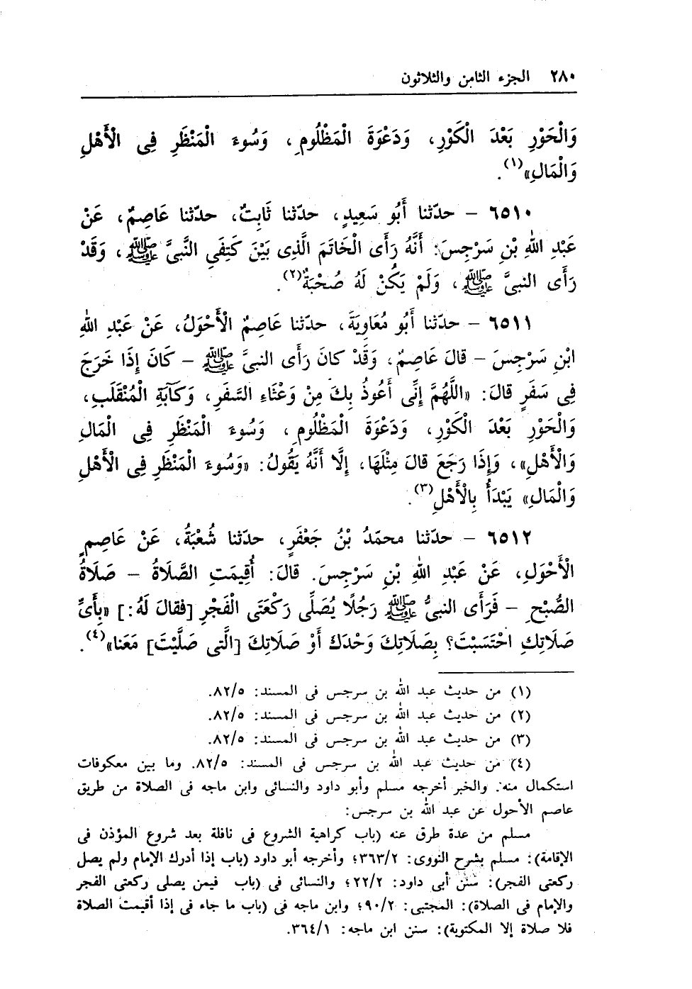 6511 - حدثنا أبو معاوية، حدثنا عاصم الأحول، عن عبد الله بن سرجس ـ قال عاصم، وقد كان رأى النبى - صلى الله عليه وسلم - ـ كان إذا خرج فى سفر قال: «اللَّهُمَّ إِنِّى أَعُوذُ بِكَ مِنْ وَعْثَاءِ السَّفَرِ، وَكَآبَةِ الْمُنْقَلَبِ، وَالْحَوْرِ بَعْدَ الْكَوْرِ، وَدَعْوَةَ الْمَظْلُومِ، وَسُوءَ المَنْظَرِ فِى الْمَالِ والأَهْلِ» ، وإذا رجع قال مثلها، إلا أنه يقول: «وَسُوءَ المَنْظَرِ فِى الأَهْلِ وَالْمَالِ» يبدأ بالأهل (¬2) .