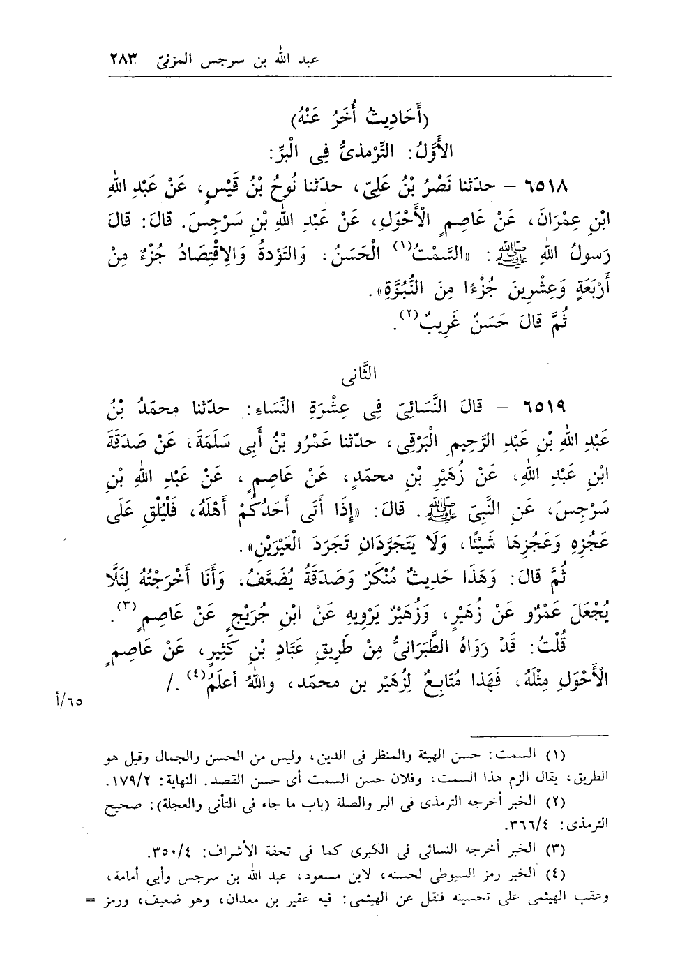 6518 - حدثنا نصر بن على، حدثنا نوح بن قيس، عن عبد الله بن عمران، عن عاصم الأحول، عن عبد الله بن سرجس. قال: قال رسول الله - صلى الله عليه وسلم -: «السَّمْتُ (¬1) الْحَسَنُ، وَالتَؤدةُ وَالاِقْتِصَادُ جُزْءٌ مِنْ أَرْبَعَةٍ وَعِشْرِينَ جُزْءًا مِنَ النُّبُوَّةِ» .