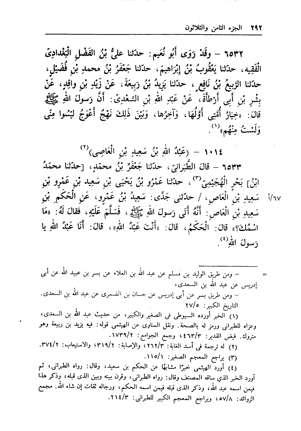 (¬4) أورد الهيثمى خبرًا مشابهًا عن الحكم بن سعيد، وقال: رواه الطبرانى، ثم أورد الخبر الذى ساقه المصنف وقال: رواه الطبرانى، وقرن بينه وبين الذى قبله، وذكر هذا فيمن اسمه عبد الله، وذكر الذى قبله فيمن اسمه الحكم، ورجاله ثقات إن شاء الله. مجمع الزوائد: 8/57؛ ويراجع المعجم الكبير للطبرانى: 3/214.