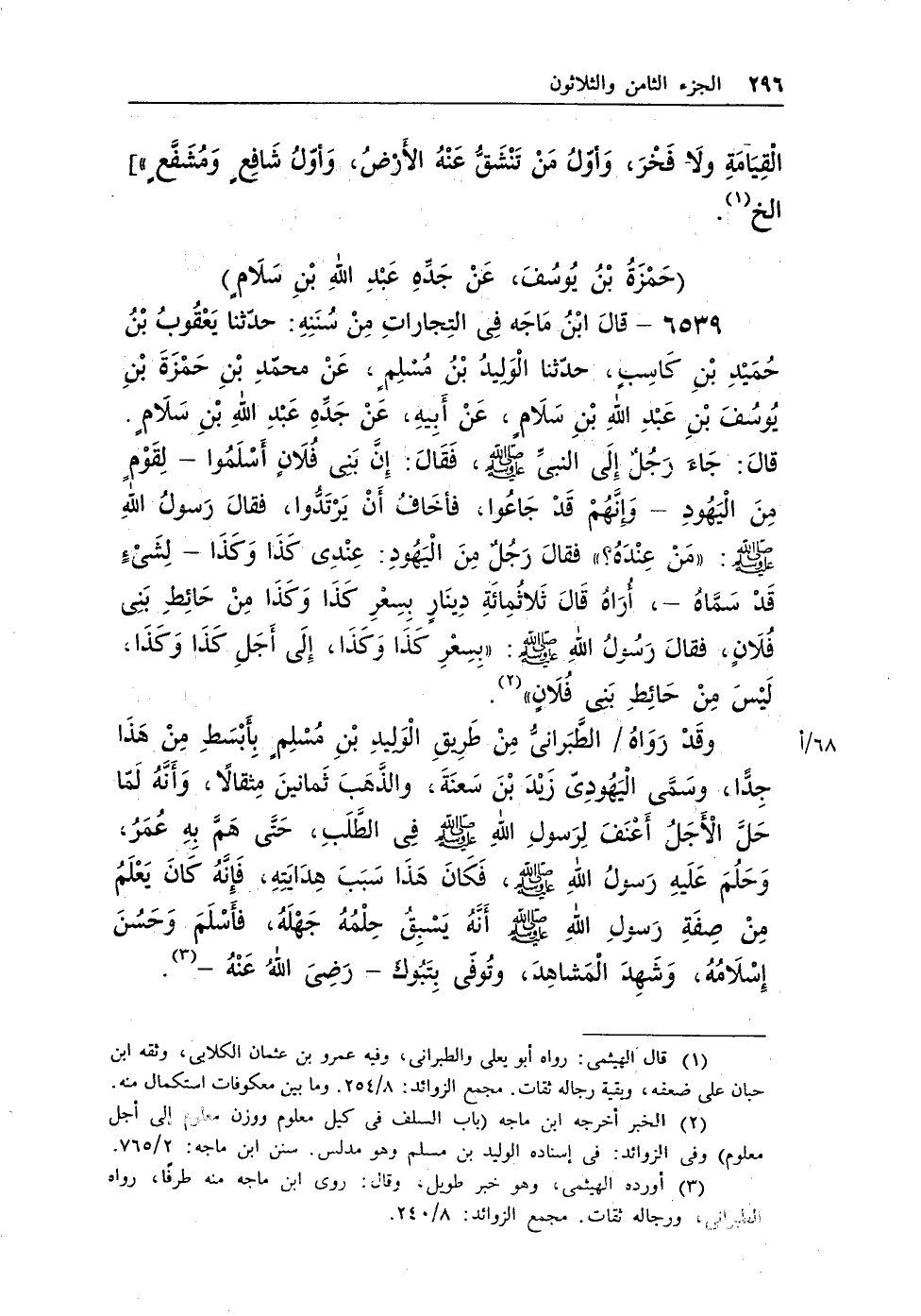 6539 - قال ابن ماجه فى التجارات من سننه: حدثنا يعقوب بن حميد بن كاسب، حدثنا الوليد بن مسلم، عن محمد بن حمزة بن يوسف بن عبد الله بن سلام، عن أبيه، عن جده عبد الله بن سلام. قال: جاء رجل إلى النبى - صلى الله عليه وسلم -، فقال: إن بنى فلان أسلموا ـ لقوم من اليهود ـ وإنهم قد جاعوا، فأخاف أن يرتدوا، فقال رسول الله - صلى الله عليه وسلم -: «مَنْ عِنْدَهُ؟» فقال رجل من اليهود: عندى كذا وكذا ـ لشىء قد سماه ـ، أراه قال ثلاثمائة دينار بسعر كذا وكذا من حائط بنى فلان، فقال رسول الله - صلى الله عليه وسلم -: «بِسِعْرِ كَذَا وَكَذَا، إِلَى أَجَلِ كَذَا وَكَذَا، لَيْسَ مِنْ حَائِطِ بَنِى فُلاَنٍ» (¬1) .