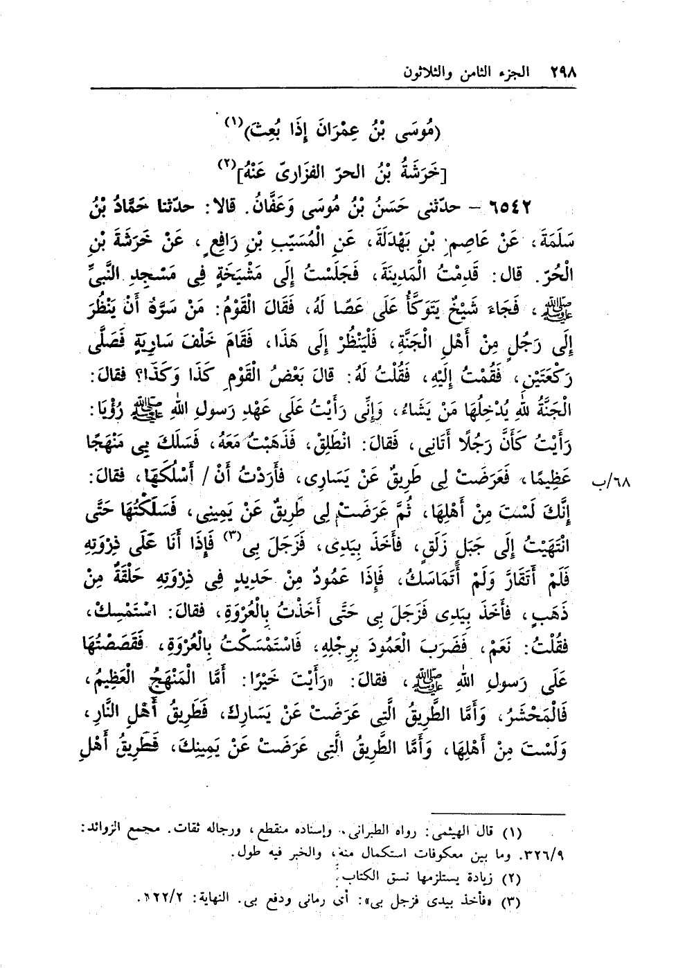 6542 - حدثنى حسن بن موسى وعفان. قالا: حدثنا حماد بن سلمة، عن عاصم بن بهدلة، عن المسيب بن رافعٍ، عن خرشة بن الحر، قال: قدمت المدينة، فجلست إلى مشيخة فى مسجد النبى - صلى الله عليه وسلم -، فجاء شيخ يتوكأ على عصا له، فقال القوم: من سره أن ينظر إلى رجل من أهل الجنة، فلينظر إلى هذا، فقام خلف سارية فصلى ركعتين، فقمت إليه، فقلت له: قال بعض القوم كذا وكذا؟ فقال: الجنة لله يدخلها من يشاء، وإنى رأيت على عهد رسول الله - صلى الله عليه وسلم - رؤيا: رأيت كأن رجلا أتانى، فقال: انطلق، فذهبت معه، فسلك بى منهجًا عظيمًا، فعرضت لى طريق عن يسارى، فأردت أن/ أسلكها، فقال: إنك لست من أهلها، ثم عرضت لى طريق عن يمينى، فسلكتها حتى انتهيت إلى جبل زلق، فأخذ بيدى، فزجل بى (¬1) فإذا أنا على ذروته فلم أتقار ولم أتماسك، فإذا عمود من حديد فى ذروته حلقة من ذهب، فأخذ بيدى فزجل بى حتى أخذت بالعروة، فقال: استمسك، فقلت: نعم، فضرب العمود برجله، فاستمسكت بالعروة، فقصصتها على رسول الله - صلى الله عليه وسلم -، فقال: «رَأَيْتَ خَيْرًا: أَمَّا الْمَنْهَجُ الْعَظِيمُ، فَالْمَحْشَرُ، وَأَمَّا الطَّرِيقُ الَّتِى عَرَضَتْ عَنْ يَسَارِك، فَطَرِيقُ أَهْلِ النَّارِ، وَلَسْتَ مِنْ أَهْلِهَا، وَأَمَّا الطَّرِيقُ الَّتى عَرَضَتْ عَنْ يَمِينِكَ، فَطَرِيقُ أَهْلِ