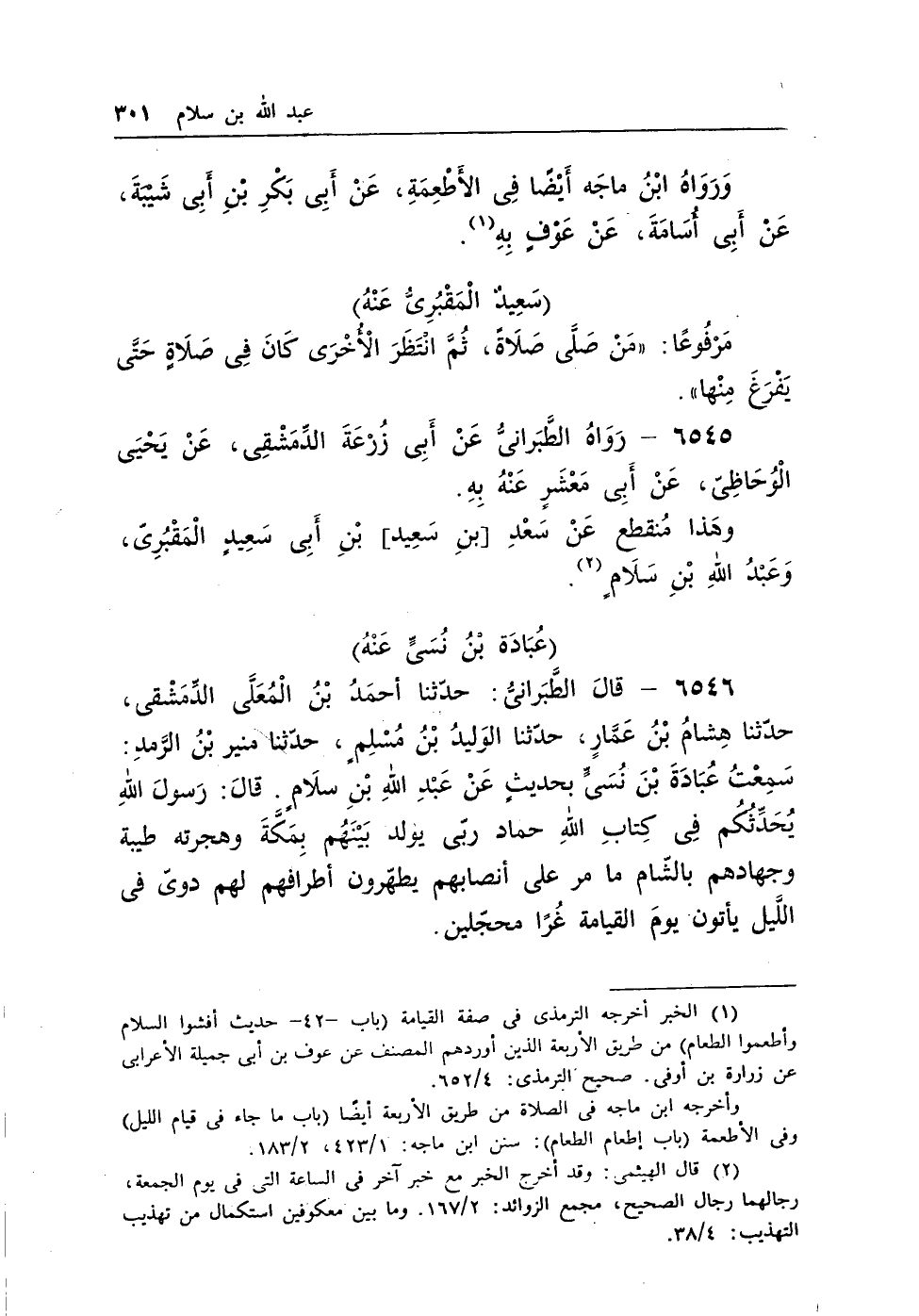 6546 - قال الطبرانى: حدثنا أحمد بن المعلى الدمشقى، حدثنا هشام بن عمار، حدثنا الوليد بن مسلم، حدثنا منير بن الرمد: سمعت عبادة بن نسى بحديث عن عبد الله بن سلام. قال: رسول الله يحدثكم فى كتاب الله حماد ربى يولد بينهم بمكة وهجرته طيبة وجهادهم بالشام ما مر على أنصابهم يطهرون أطرافهم لهم دوى فى الليل يأتون يوم القيامة غرًا محجلين.