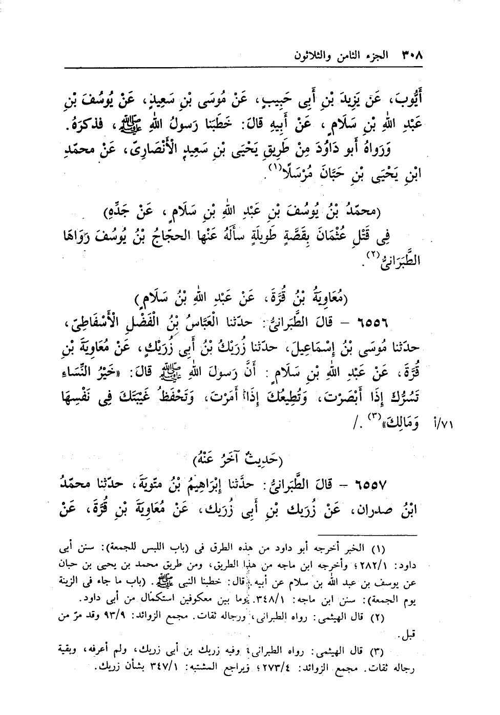 (¬1) الخبر أخرجه أبو داود من هذه الطرق فى (باب اللبس للجمعة) : سنن أبى داود: 1/282؛ وأخرجه ابن ماجه من هذا الطريق، ومن طريق محمد بن يحيى بن حبان عن يوسف بن عبد الله بن سلام عن أبيه. قال: خطبنا النبى - صلى الله عليه وسلم -. (باب ما جاء فى الزينة يوم الجمعة) : سنن ابن ماجه: 1/348. وما بين معكوفين استكمال من أبى داود.