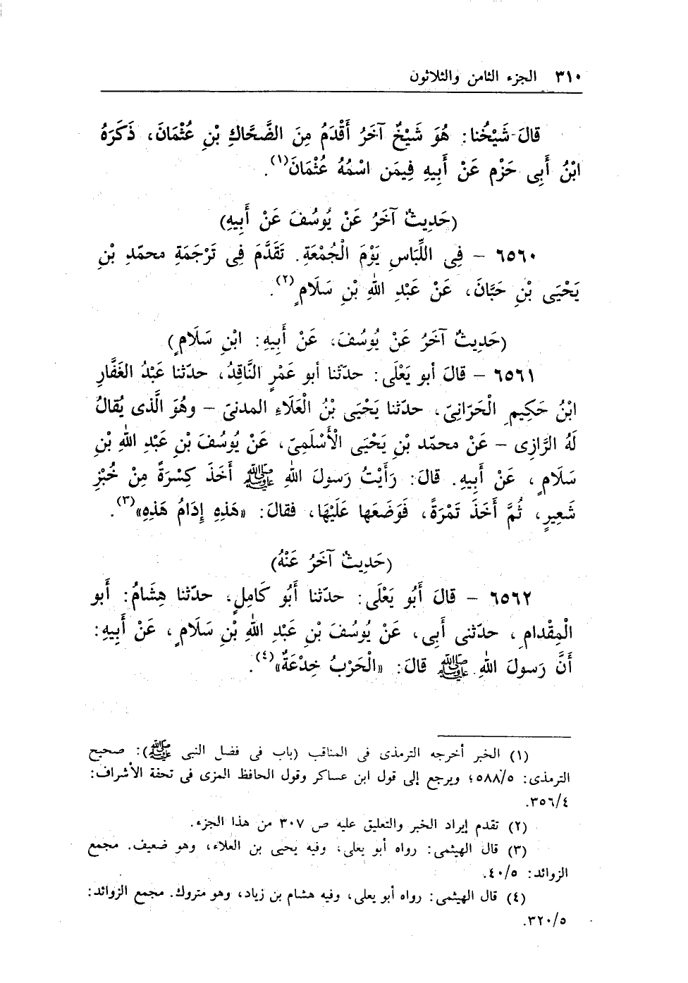 6560 - فى اللباس يوم الجمعة، تقدم فى ترجمة محمد بن يحيى بن حبان، عن عبد الله بن سلام (¬1) .