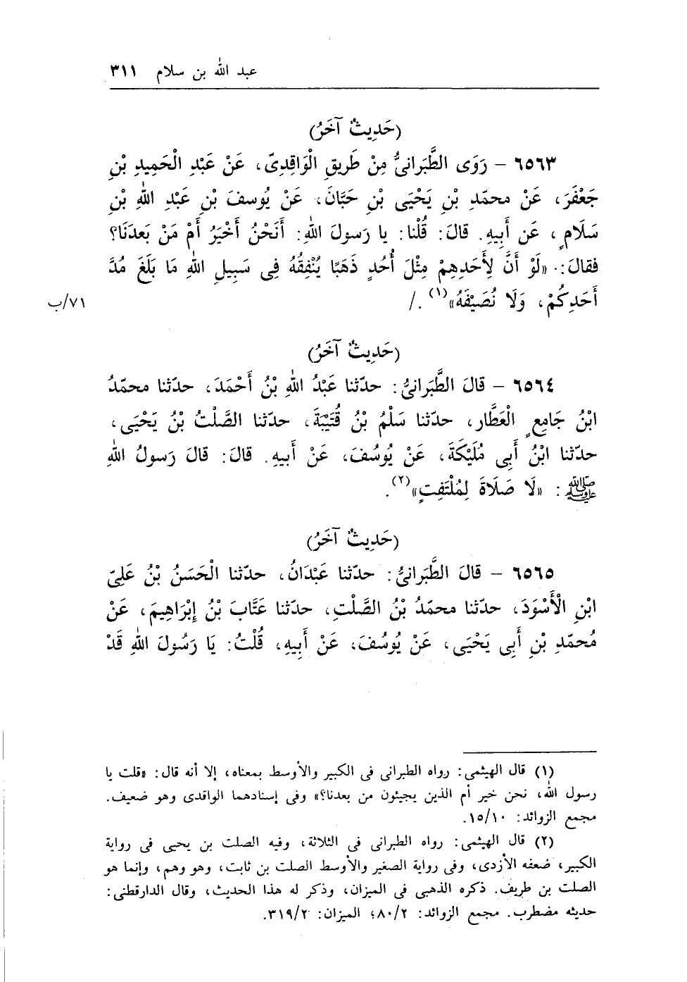 6563 - روى الطبرانى من طريق الواقدى، عن عبد الحميد بن جعفر، عن محمد بن يحيى بن حبان، عن يوسف بن عبد الله بن سلام، عن أبيه. قال: قلنا: يا رسول الله: أنحن أخير أم من بعدنا؟ فقال: «لَوْ أَنَّ لأَحَدِهِمْ مِثْلَ أُحُدٍ ذَهَبًا يُنْفِقُهُ فِى سَبِيلِ اللهِ مَا بَلَغَ مُدَّ أَحَدِكُمْ، وَلاَ نُصَيْفَهُ» (¬1) . /
