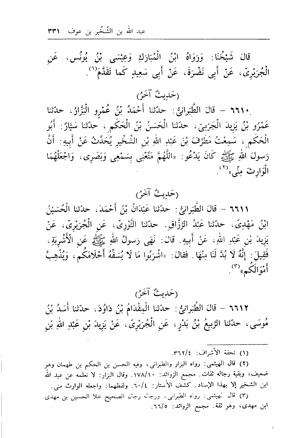 6610 - قال الطبرانى: حدثنا أحمد بن عمرو البزار، حدثنا عمرو بن يزيد الجرمى، حدثنا الحسن بن الحكم، حدثنا سيار: أبو الحكم، سمعت مطرف بن عبد الله بن الشخير يحدث عن أبيه: أن رسول الله - صلى الله عليه وسلم - كان يدعو: «اللَّهُمَّ مَتِّعْنِى بِسَمْعِى وَبَصَرِى، وَاجْعَلْهُمَا الْوَارِثَ مِنِّى» (¬1) .