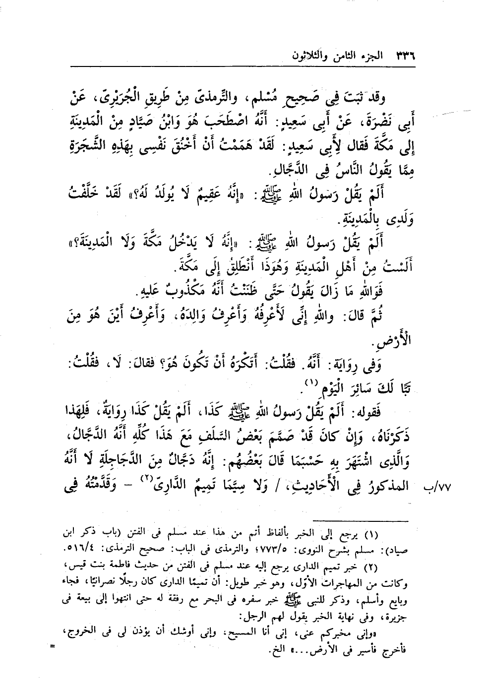 (¬2) خبر تميم الدارى يرجع إليه عند مسلم فى الفتن من حديث فاطمة بنت قيس، وكانت من المهاجرات الأول، وهو خبر طويل: أن تميمًا الدارى كان رجلاً نصرانيًا، فجاء وبايع وأسلم، وذكر للنبى - صلى الله عليه وسلم - خبر سفره فى البحر مع رفقة له حتى انتهوا إلى بيعة فى جزيرة، وفى نهاية الخبر يقول لهم الرجل: «وإنى مخبركم عنى، إنى أنا المسيح، وإنى أوشك أن يؤذن لى فى الخروج، فأخرج فأسير فى الأرض ... » الخ. ونقل الإمام النووى فى قصة ابن صياد أقولاً تطول أهمها: قال العلماء: قصته مشكلة، وأمره مشتبه فى أنه هل هو المسيح الدجال المشهور أم غيره؟ ولا =