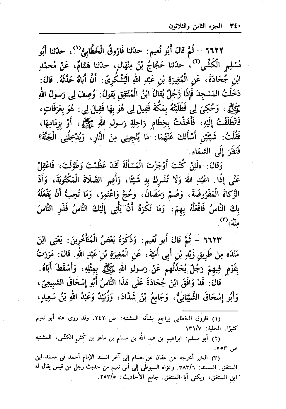 6622 - ثم قال أبو نعيم: حدثنا فاروق الخطابى (¬1) ، حدثنا أبو مسلم الكشى (¬2) ، حدثنا حجاج بن منهال، حدثنا همام، عن محمد ابن جحادة، عن المغيرة ابن عبد الله اليشكرى: أن أباه حدثه. قال: دخلت المسجد فإذا رجل يقال ابن المنتفق يقول: وصف لى رسول الله - صلى الله عليه وسلم -، وحكى لى فطلبته بمكة فقيل لى هو بها فقيل لى: هو بعرفات، فانطلقت إليه، فأخذت بخطام راحلة رسول الله - صلى الله عليه وسلم -، أو بزمامها، فقلت: شيئين أسألك عنهما: ما ينجينى من النار، ويدخلنى الجنة؟ فنظر إلى السماء.