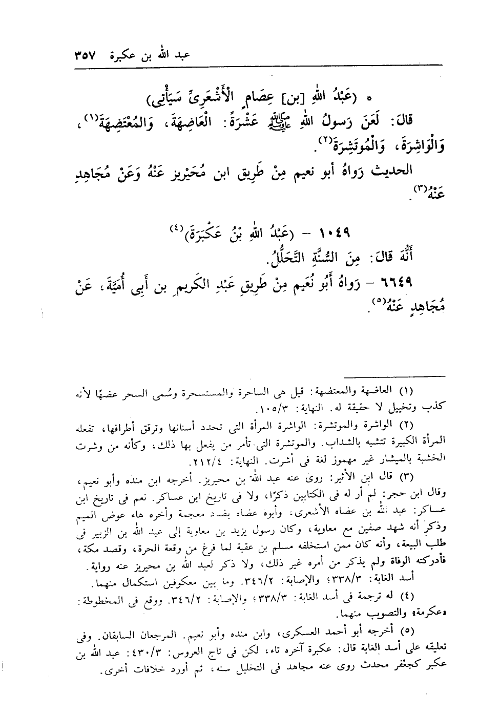 (¬2) أخرجه أبو أحمد العسكرى، وابن منده وأبو نعيم. المرجعان السابقان. وفى تعليقه على أسد الغابة قال: عكبرة آخره تاء، لكن فى تاج العروس: 3/430: عبد الله بن عكبر كجعفر محدث روى عنه مجاهد فى التخليل سنه، ثم أورد خلافات أخرى.