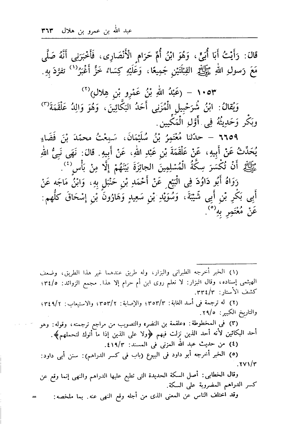 (¬1) له ترجمة فى أسد الغابة: 3/353؛ والإصابة: 2/353؛ والاستيعاب: 2/349؛ والتاريخ الكبير: 5/29.