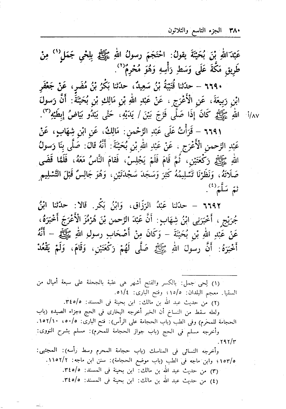 عبد الله بن بحينة يقول: احتجم رسول الله - صلى الله عليه وسلم - بلحى جملٍ (¬1) من طريق مكة على وسط رأسه وهو محرم (¬2) .