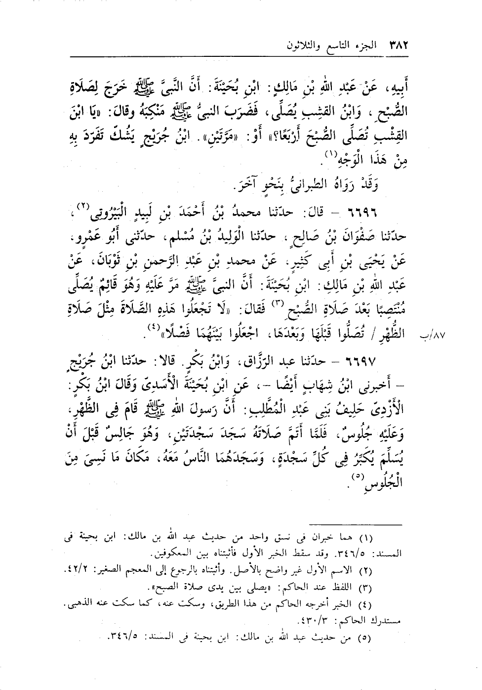 (¬1) هما خبران فى نسق واحد من حديث عبد الله بن مالك: ابن بحينة فى المسند: 5/346. وقد سقط الخبر الأول فأثبتناه بين المعكوفين.