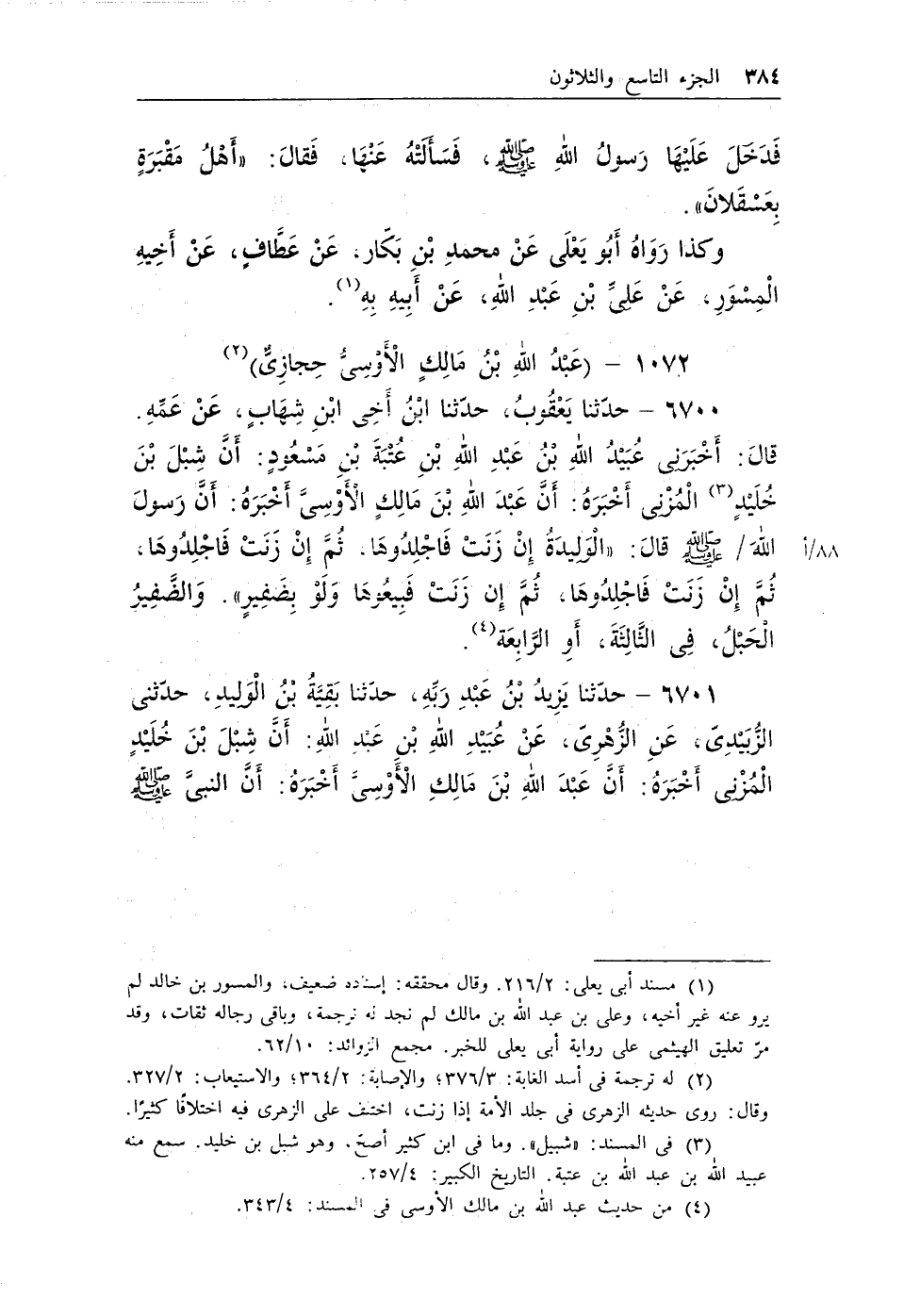 (¬1) مسند أبى يعلى: 2/216. وقال محققه: إسناده ضعيف، والمسور بن خالد لم يرو عنه غير أخيه، وعلى بن عبد الله بن مالك لم نجد له ترجمة، وباقى رجاله ثقات، وقد مر تعليق الهيثمى على رواية أبى يعلى للخبر. مجمع الزوائد: 10/62.