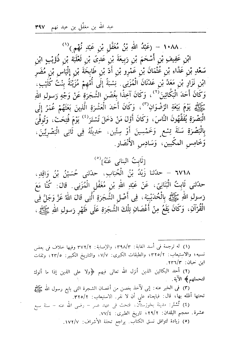 (¬1) له ترجمة فى أسد الغابة: 3/398؛ والإصابة: 2/372 وفيها خلاف فى بعض نسبه؛ والاستيعاب: 2/325؛ والطبقات الكبرى: 7/7؛ والتاريخ الكبير: 5/23؛ وثقات ابن حبان: 3/236.