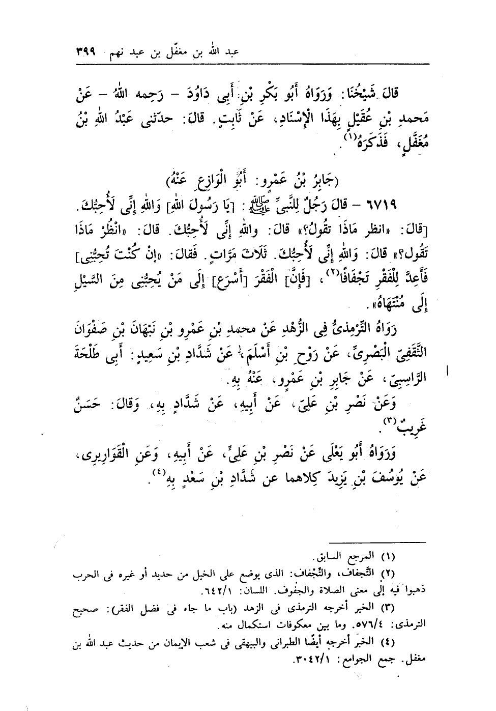 رواه الترمذى فى الزهد عن محمد بن عمرو بن نبهان بن صفوان الثقفى البصرى، عن روح بن أسلم، عن شداد بن سعيدٍ: أبى طلحة الراسبى، عن جابر بن عمرو، عنه به.