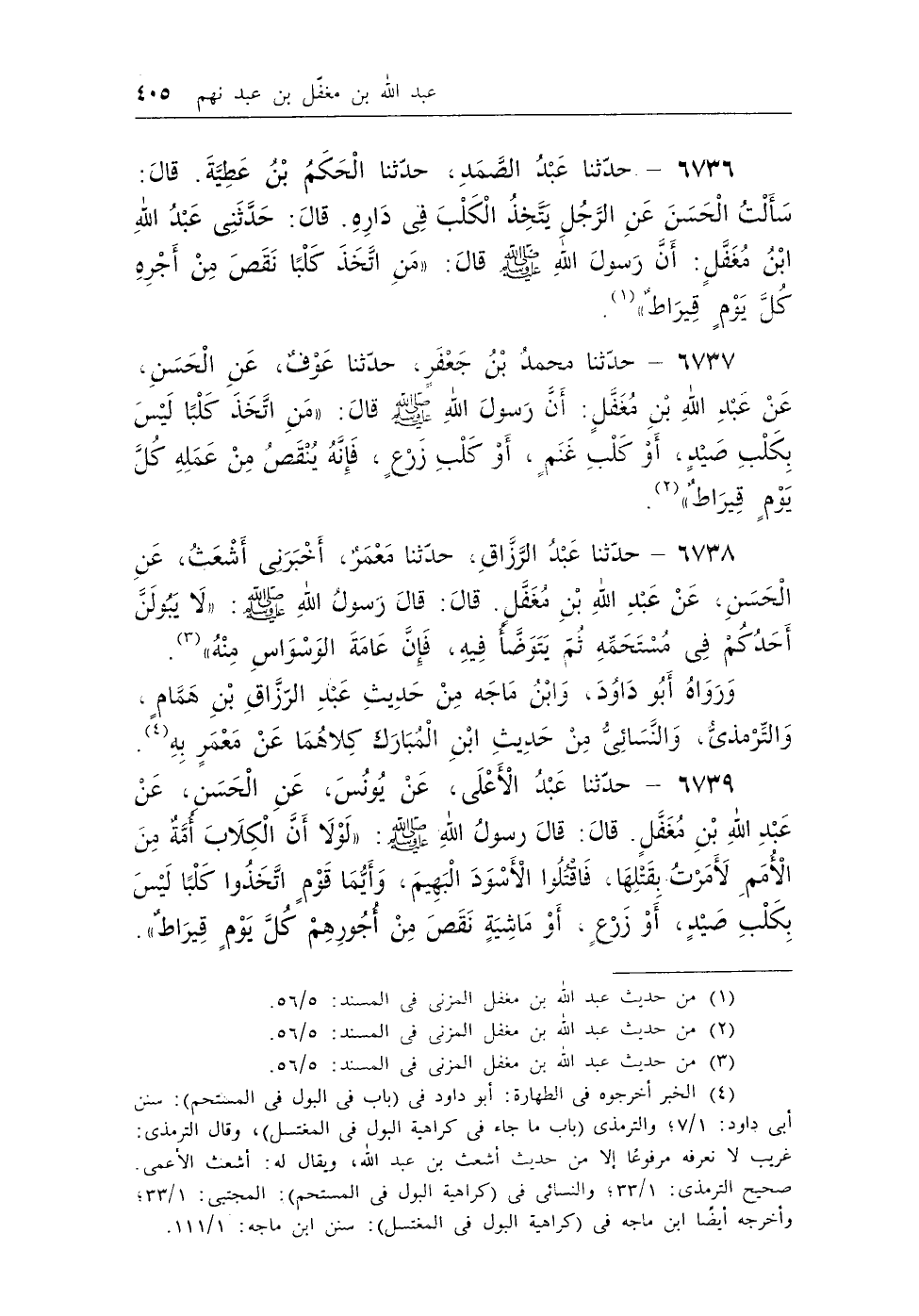6737 - حدثنا محمد بن جعفر، حدثنا عوف، عن الحسن، عن عبد الله بن مغفل: أن رسول الله - صلى الله عليه وسلم - قال: «مَنِ اتَّخَذَ كَلْبًا لَيْسَ بِكَلْبِ صَيْدٍ، أَوْ كَلْبِ غَنَمٍ، أَوْ كَلْبِ زَرْعٍ، فَإِنَّهُ يُنْقَصُ مِنْ عمله كُلَّ يَوْمٍ قِيرَاطٌ» (¬2) .