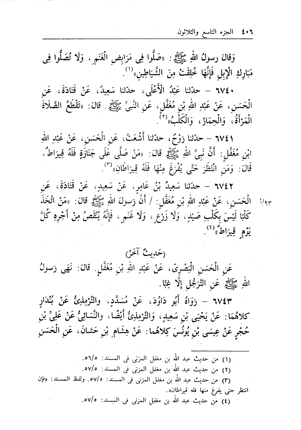6740 - حدثنا عبد الأعلى، حدثنا سعيد، عن قتادة، عن الحسن، عن عبد الله بن مغفل، عن النبى - صلى الله عليه وسلم -. قال: «تَقْطَعُ الصَّلاَةَ الْمَرْأَةُ، وَالْحِمَارُ، وَالْكَلْبُ» (¬1) .