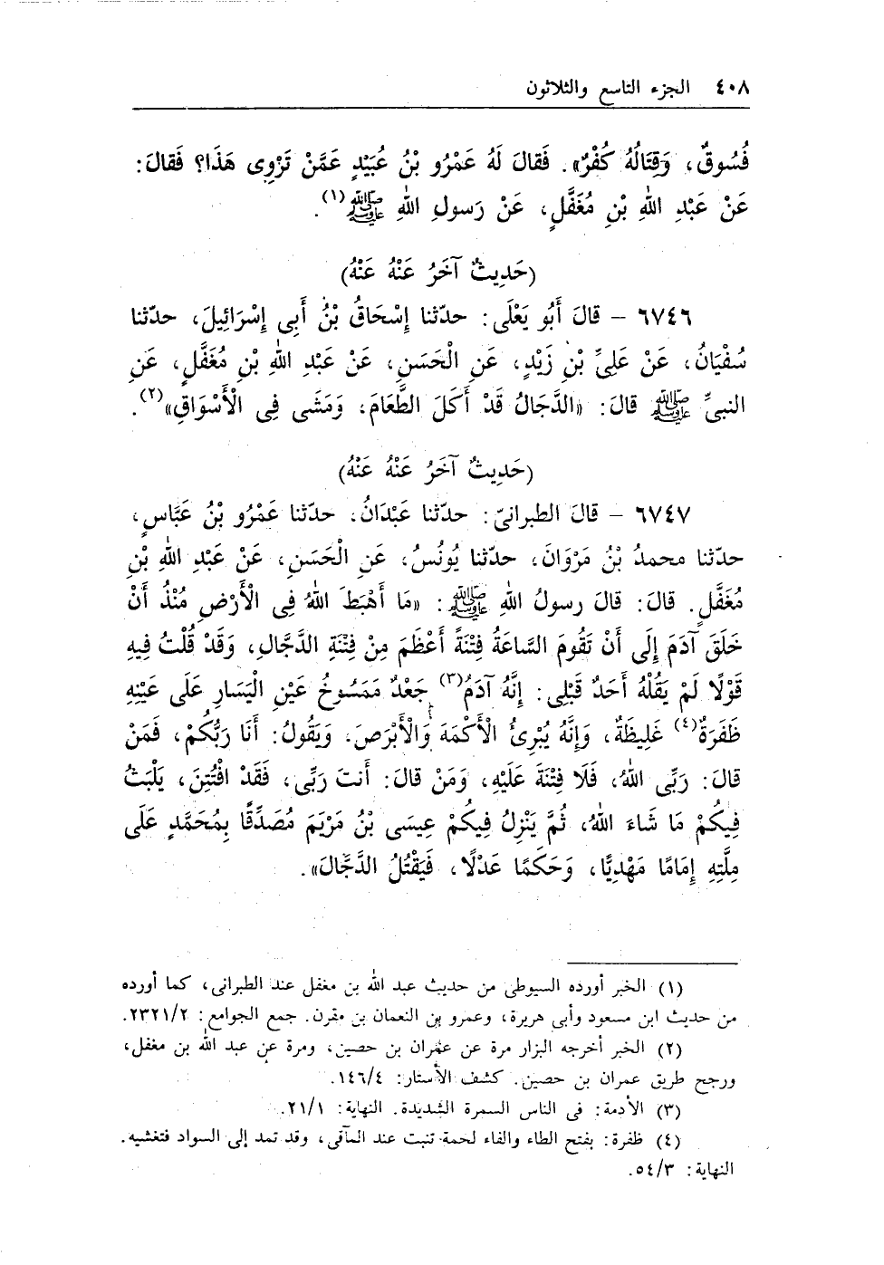 6746 - قال أبو يعلى: حدثنا إسحاق بن أبى إسرائيل، حدثنا سفيان، عن على بن زيدٍ، عن الحسن، عن عبد الله بن مغفلٍ، عن النبى - صلى الله عليه وسلم - قال: «الدَّجَالُ قَدْ أَكَلَ الطَّعَامَ، وَمَشَى فِى الأَسْوَاقِ» (¬1) .