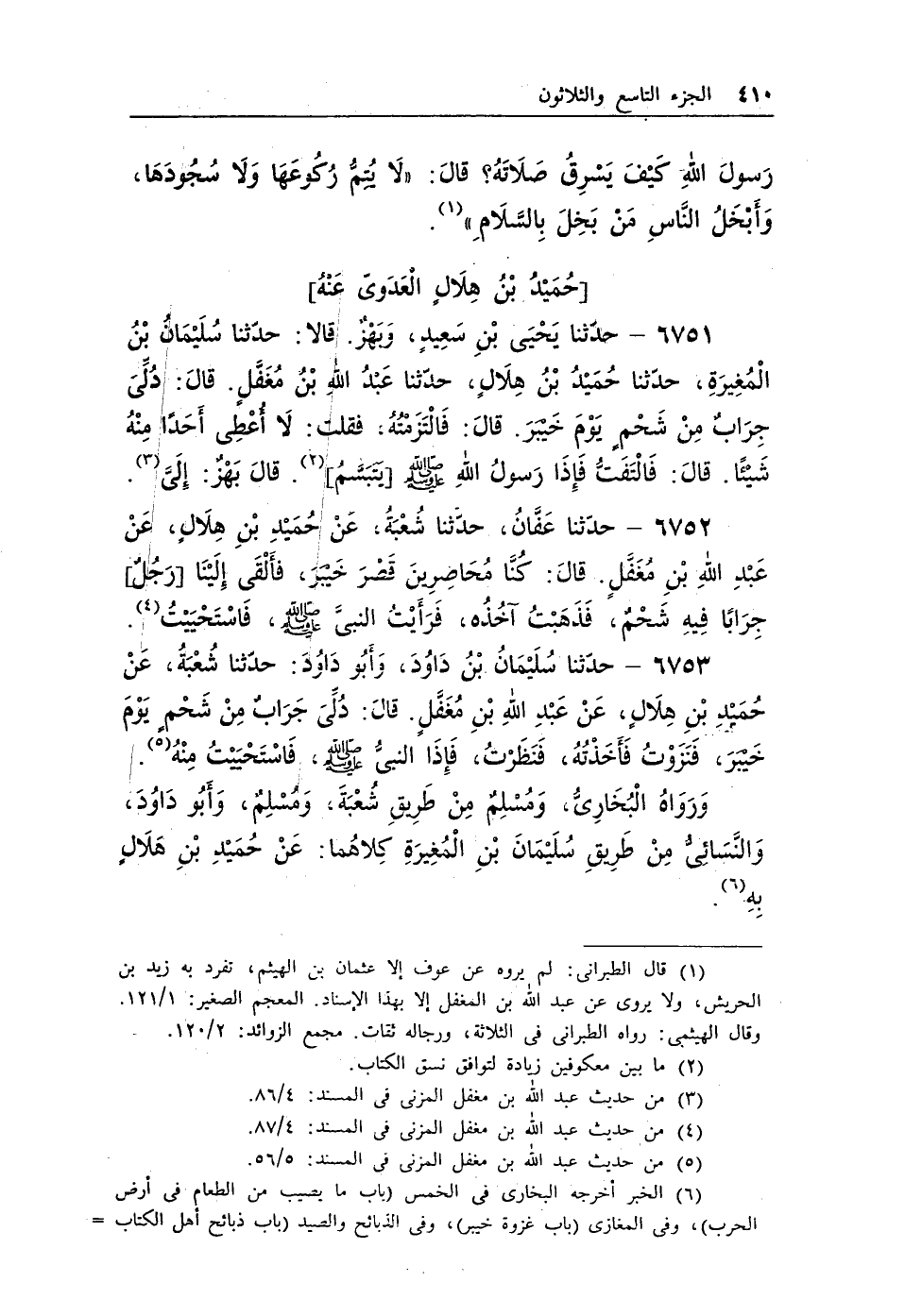 ورواه البخارى، ومسلم من طريق شعبة، ومسلم، وأبو داود، والنسائى من طريق سليمان بن المغيرة كلاهما: عن حميد بن هلالٍ به (¬5) .
