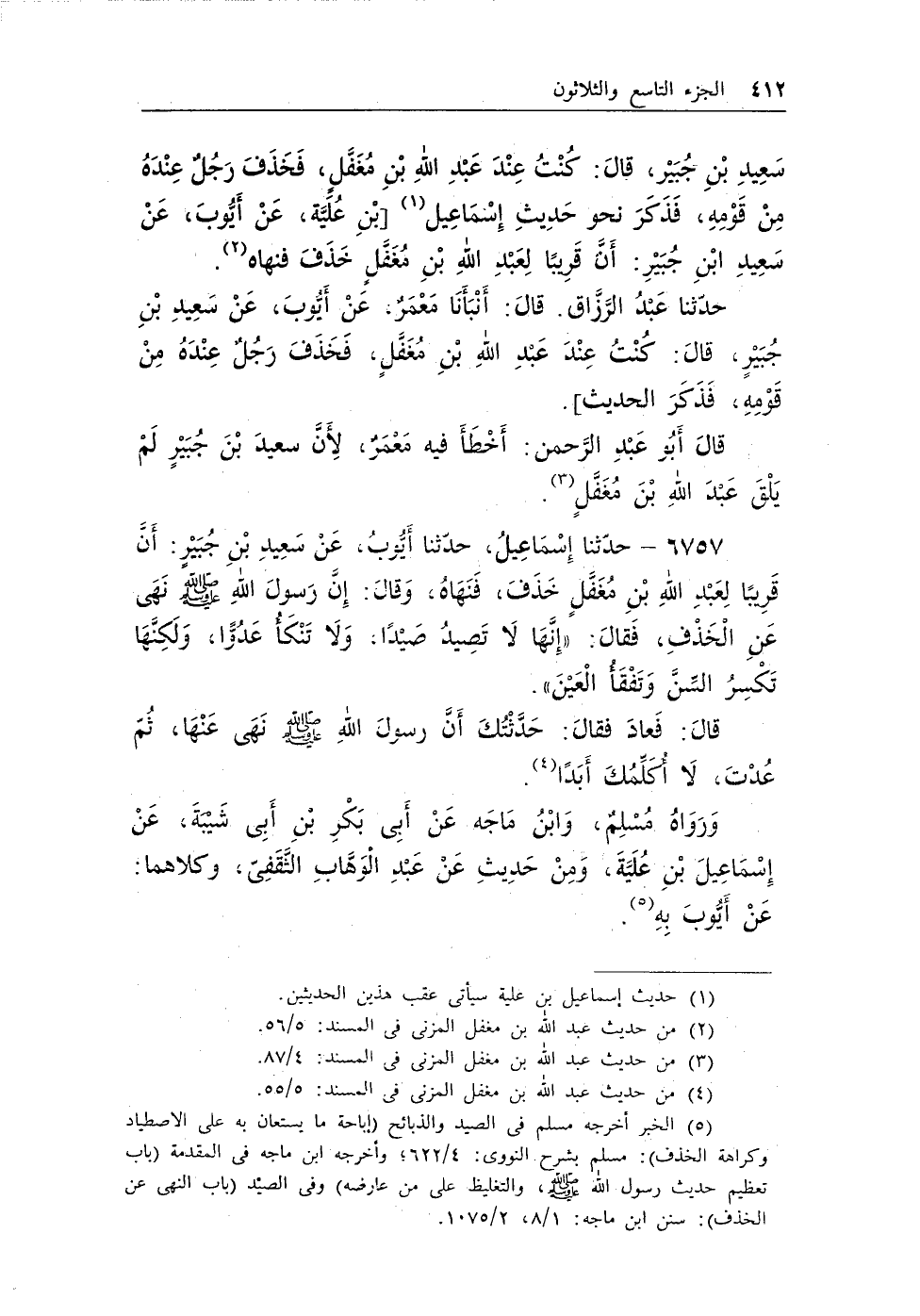 (¬2) الخبر أخرجه مسلم فى الصيد والذبائح (إباحة ما يستعان به على الاصطياد وكراهة الخذف) : مسلم بشرح النووى: 4/622؛ وأخرجه ابن ماجه فى المقدمة (باب تعظيم حديث رسول الله - صلى الله عليه وسلم -، والتغليظ على من عارضه) وفى الصيد (باب النهى عن الخذف) : سنن ابن ماجه: 1/8، 2/1075.