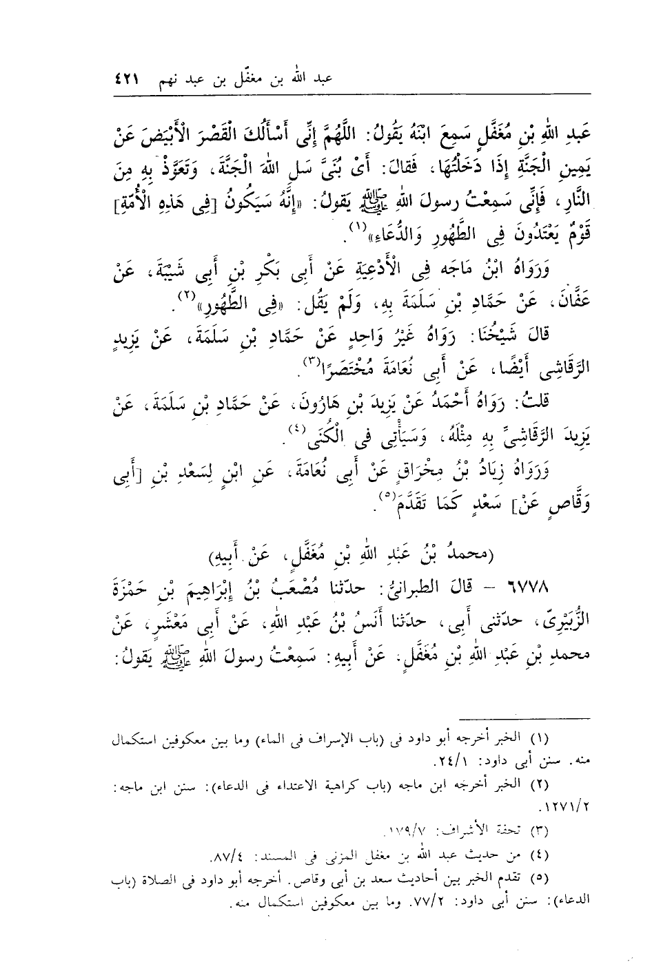 عبد الله بن مغفل سمع ابنه يقول: اللهم إنى أسألك القصر الأبيض عن يمين الجنة إذا دخلتها، فقال: أى بنى سل الله الجنة، وتعوذ به من النار، فإنى سمعت رسول الله - صلى الله عليه وسلم - يقول: «إِنَّهُ سَيَكُونُ [فِى هَذِهِ الأُمّةِ] قَوْمٌ يَعْتَدُونَ فِى الطَّهُورِ وَالدُّعَاءِ» (¬1) .