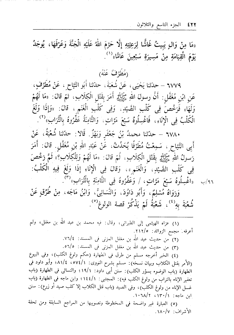 ورواه مسلم، وأبو داود، والنسائى، وابن ماجه، من طرق عن شعبة به (¬3) ، شعبة لم يذكر قصة الولوغ (¬4) .