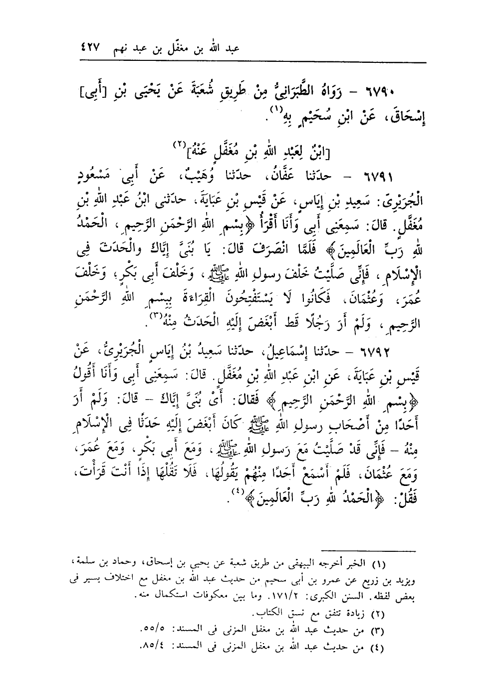 6791 - حدثنا عفان، حدثنا وهيب، عن أبى مسعود الجريرى: سعيد بن إياس، عن قيس بن عباية، حدثنى ابن عبد الله بن مغفل. قال: سمعنى أبى وأنا أقرأ {بِسْمِ اللَّهِ الرَّحْمَنِ الرَّحِيمِ، الْحَمْدُ لِلَّهِ رَبِّ الْعَالَمِينَ} فلما انصرف قال: يا بنى إياك والحدث فى الإسلام، فإنى صليت خلف رسول الله - صلى الله عليه وسلم -، وخلف أبى بكر، وخلف عمر، وعثمان، فكانوا لا يستفتحون القراءة ببسم الله الرحمن الرحيم، ولم أر رجلاً قط أبغض إليه الحدث منه (¬3) .