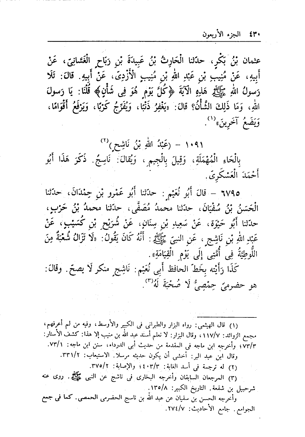 (¬2) المرجعان السابقان وأخرجه البخارى فى ناشج عن النبى - صلى الله عليه وسلم -. روى عنه شرحبيل بن شفعة. التاريخ الكبير: 8/135. وأخرجه الحسن بن سفيان عن عبد الله بن ناسج الحضرمى الحمصى. كما فى جمع الجوامع. جامع الأحاديث: 7/274.
