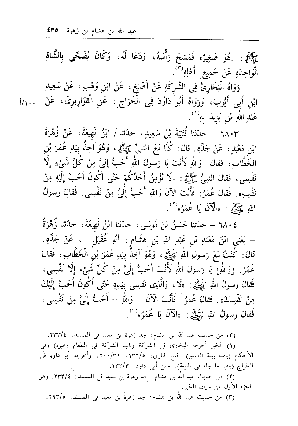 (¬1) من حديث عبد الله بن هشام: جد زهرة بن معبد فى المسند: 4/233. وهو الجزء الأول من سياق الخبر.