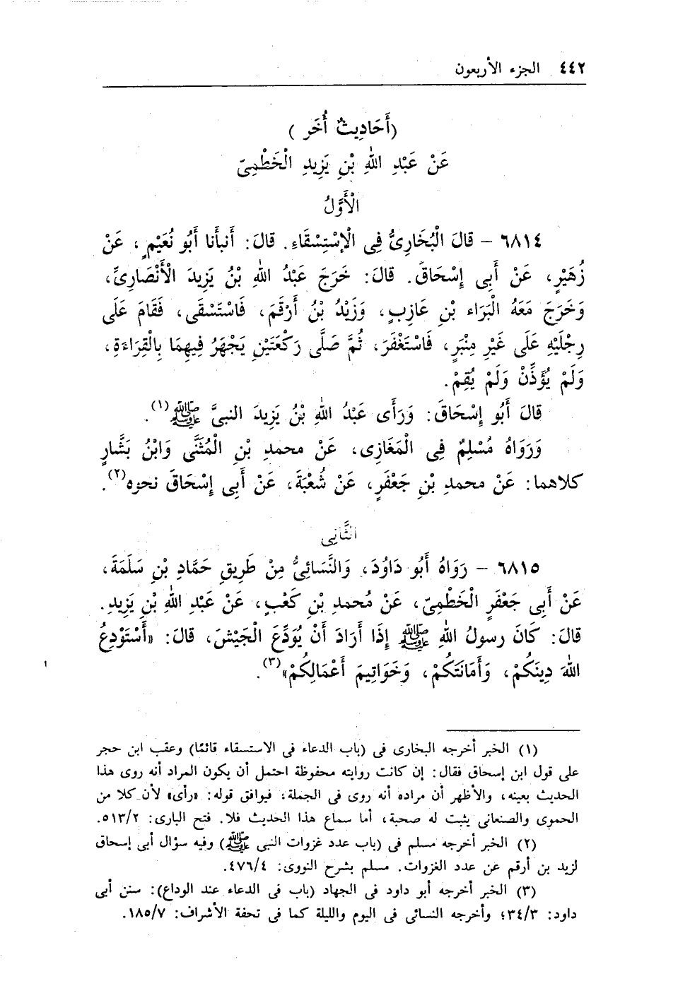 6814 - قال البخارى فى الإستسقاء. قال: أنبأنا أبو نعيم، عن زهير، عن أبى إسحاق. قال: خرج عبد الله بن يزيد الأنصارى، وخرج معه البراء بن عازب، وزيد بن أرقم، فاستسقى، فقام على رجليه على غير منبر، فاستغفر، ثم صلى ركعتين يجهر فيهما بالقراءة، ولم يؤذن ولم يقم.