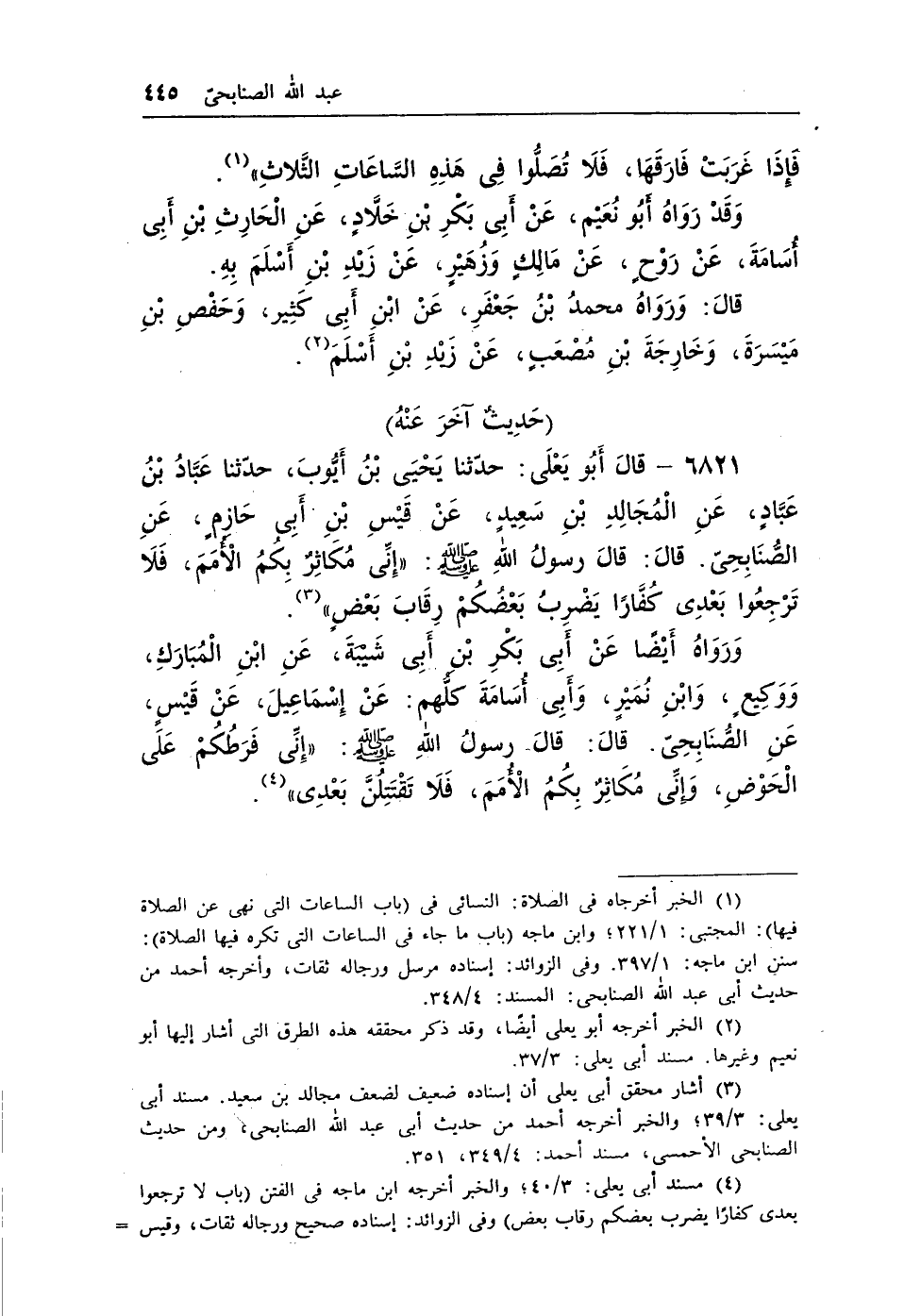(¬1) أشار محقق أبى يعلى أن إسناده ضعيف لضعف مجالد بن سعيد. مسند أبى يعلى: 3/39؛ والخبر أخرجه أحمد من حديث أبى عبد الله الصنابحى، ومن حديث الصنابحى الأحمسى، مسند أحمد: 4/349، 351.
