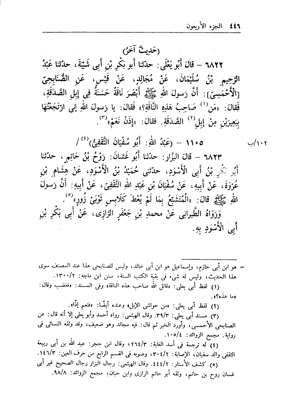 6822 - قال أبو يعلى: حدثنا أبو بكر بن أبى شيبة، حدثنا عبد الرحيم بن سليمان، عن مجالد، عن قيس، عن الصنابحى [الأحمسى] : أن رسول الله - صلى الله عليه وسلم - أبصر ناقة حسنة فى إبل الصدقة، فقال: «مَن (¬1) صَاحِبُ هَذِهِ النَّاقَةِ؟» فقال: يا رسول الله إنى ارتجعتها ببعيرين من إبل (¬2) الصدقة. فقال: «إِذَنْ نَعَمْ» (¬3) .