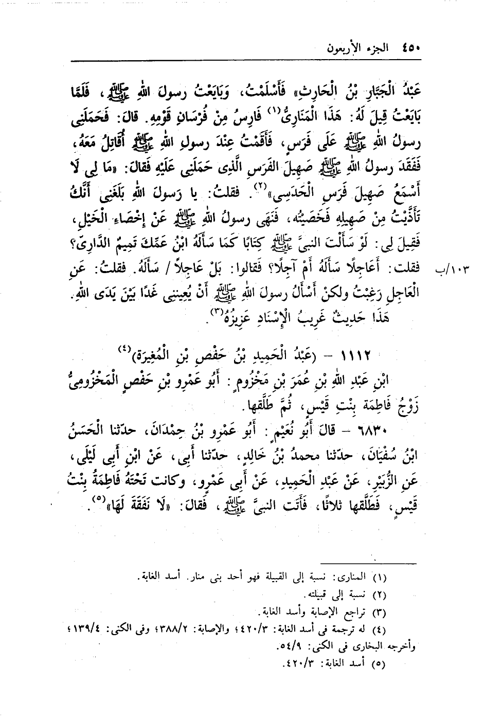 عَبْدُ الْجَبَّارِ بْنُ الْحَارِثِ» فأسلمت، وبايعت رسول الله - صلى الله عليه وسلم -، فلما بايعت قيل له: هذا المنارى (¬1) فارس من فرسان قومه. قال: فحملنى رسول الله - صلى الله عليه وسلم - على فرس، فأقمت عند رسول الله - صلى الله عليه وسلم - أقاتل معه، ففقد رسول الله - صلى الله عليه وسلم - صهيل الفرس الذى حملنى عليه فقال: «مَا لِى لاَ أَسْمَعُ صَهِيلَ فَرَسِ الْحَدَسِى» (¬2) . فقلت: يا رسول الله بلغنى أنك تأذيت من صهيله فخصيته، فنهى رسول الله - صلى الله عليه وسلم - عن إخصاء الخيل، فقيل لى: لو سألت النبى - صلى الله عليه وسلم - كتابًا كما سأله ابن عمك تميم الدارى؟ فقلت: أعاجلاً سأله أم آجلاً؟ فقالوا: بل عاجلاً/ سأله. فقلت: عن العاجل رغبت ولكن أسأل رسول الله - صلى الله عليه وسلم - أن يعيننى غدًا بين يدى الله، هذا حديث غريب الإسناد عزيزه (¬3) .