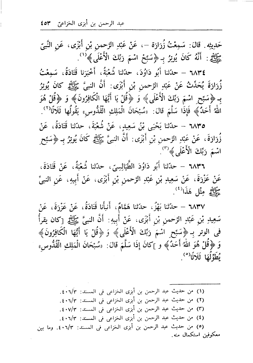 6837 - حدثنا بهز، حدثنا همام، أنبأنا قتادة، عن عزرة، عن سعيد بن عبد الرحمن بن أبزى، عن أبيه: أن النبى - صلى الله عليه وسلم -[كان يقرأ فى الوتر بـ {سَبِّحِ اسْمَ رَبِّكَ الْأَعْلَى} و {قُلْ يَا أَيُّهَا الْكَافِرُونَ} و {قُلْ هُوَ اللَّهُ أَحَدٌ} و] كان إذا سلم قال: «سُبْحَانَ الْمَلِكِ الْقُدُّوسِ» يطولها ثلاثًا (¬4) .
