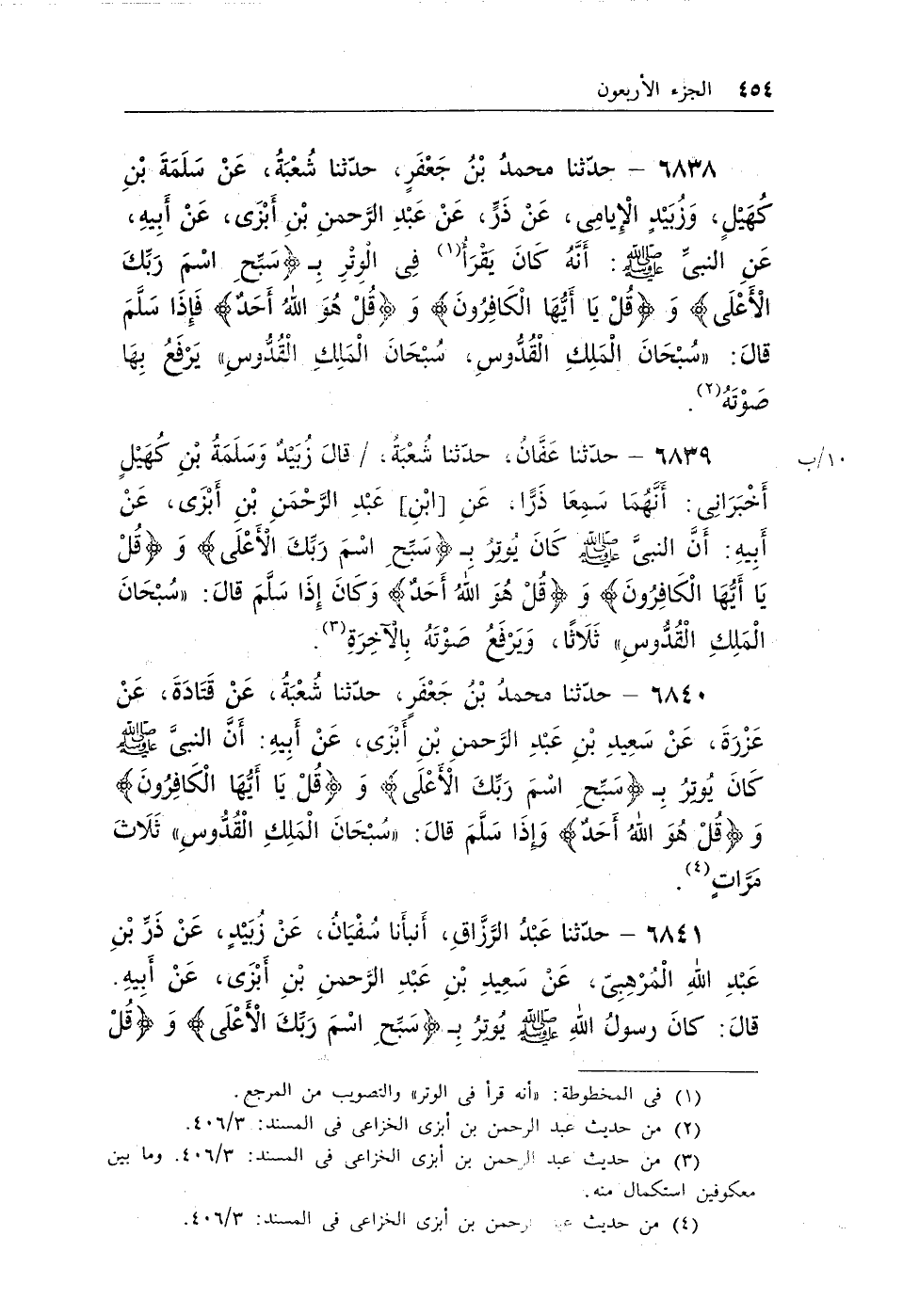 6838 - حدثنا محمد بن جعفر، حدثنا شعبة، عن سلمة بن كهيل، وزبيد الإيامى، عن ذر، عن عبد الرحمن بن أبزى، عن أبيه، عن النبى - صلى الله عليه وسلم -: أنه كان يقرأ (¬1) فى الوتر بـ {سَبِّحِ اسْمَ رَبِّكَ الْأَعْلَى} و {قُلْ يَا أَيُّهَا الْكَافِرُونَ} و {قُلْ هُوَ اللَّهُ أَحَدٌ} فإذا سلم قال: «سُبْحَانَ الْمَلِكِ الْقُدُّوسِ سُبْحَانَ الْمَلِكِ الْقُدُّوسِ» يرفع بها صوته (¬2) .