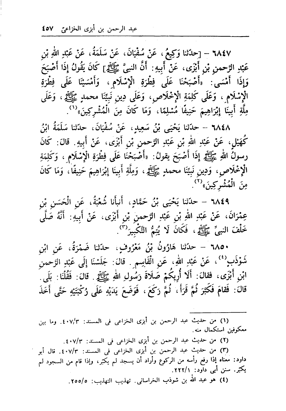 6848 - حدثنا يحيى بن سعيدٍ، عن سفيان، حدثنا سلمة ابن كهيلٍ، عن عبد الله بن عبد الرحمن بن أبزى، عن أبيه. قال: كان رسول الله - صلى الله عليه وسلم - إذا أصبح يقول: «أَصْبَحْنَا عَلَى فِطْرَةِ الإِسْلاَمِ، وَكَلِمَةِ الإِخْلاَصِ، وَعَلَى دِينِ نَبِيِّنَا محمدٍ - صلى الله عليه وسلم -، وَمِلَّةِ أَبِينَا إِبْرَاهِيمَ حَنِيفًا، وَمَا كَانَ مِنَ الْمُشْرِكِينَ» (¬2) .
