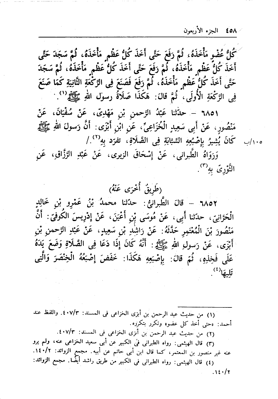 6852 - قال الطبرانى: حدثنا محمد بن عمرو بن خالد الحرانى، حدثنا أبى، عن موسى بن أعين، عن إدريس الكوفى: أن منصور بن المعتمر حدثه: عن راشد بن سعيدٍ، عن عبد الرحمن بن أبزى، عن رسول الله - صلى الله عليه وسلم -: أنه كان إذا دعا فى الصلاة وضع يده على فخذه، ثم قال: بإصبعه هكذا: خفض إصبعه الخنصر والتى تليها (¬3) .