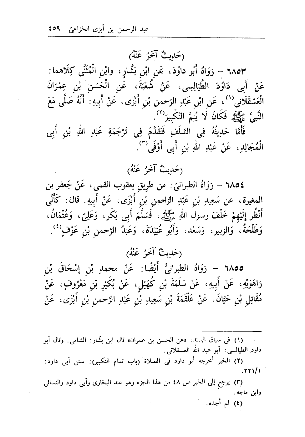 6853 - رواه أبو داود، عن ابن بشار، وابن المثنى كلاهما: عن أبى داود الطيالسى، عن شعبة، عن الحسن بن عمران العسقلانى (¬1) ، عن ابن عبد الرحمن بن أبزى، عن أبيه: أنه صلى مع النبى - صلى الله عليه وسلم - فكان لا يتم التكبير (¬2) .