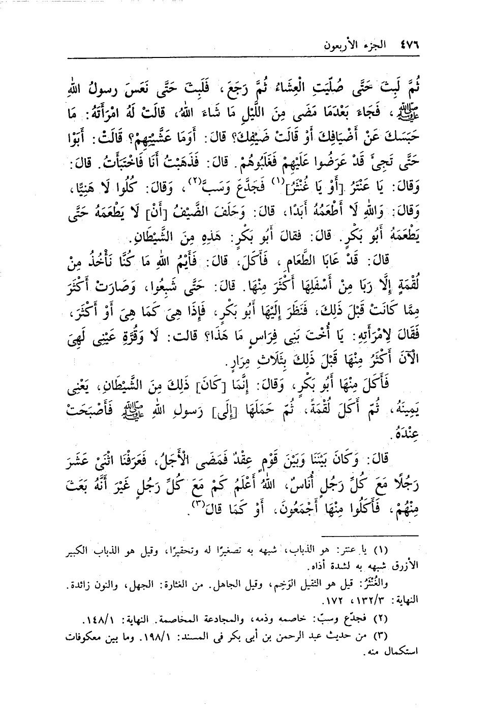 ثم لبث حتى صليت العشاء ثم رجع، فلبث حتى نعس رسول الله - صلى الله عليه وسلم -، فجاء بعدما مضى من الليل ما شاء الله، قالت له امرأته: ما حبسك عن أضيافك أو قالت ضيفك؟ قال: أو ما عشيتهم؟ قالت: أبوا حتى تجىء قد عرضوا عليهم فغلبوهم. قال: فذهبت أنا فاختبأت. قال: وقال: يا عنتر [أو يا غنثر] (¬1) فجدع وسب (¬2) ، وقال: كلوا لا هنيًا، وقال: والله لا أطعمه أبدًا، قال: وحلف الضيف [أن] لا يطعمه حى يطعمه أبو بكر. قال: فقال أبو بكر: هذه من الشيطان.