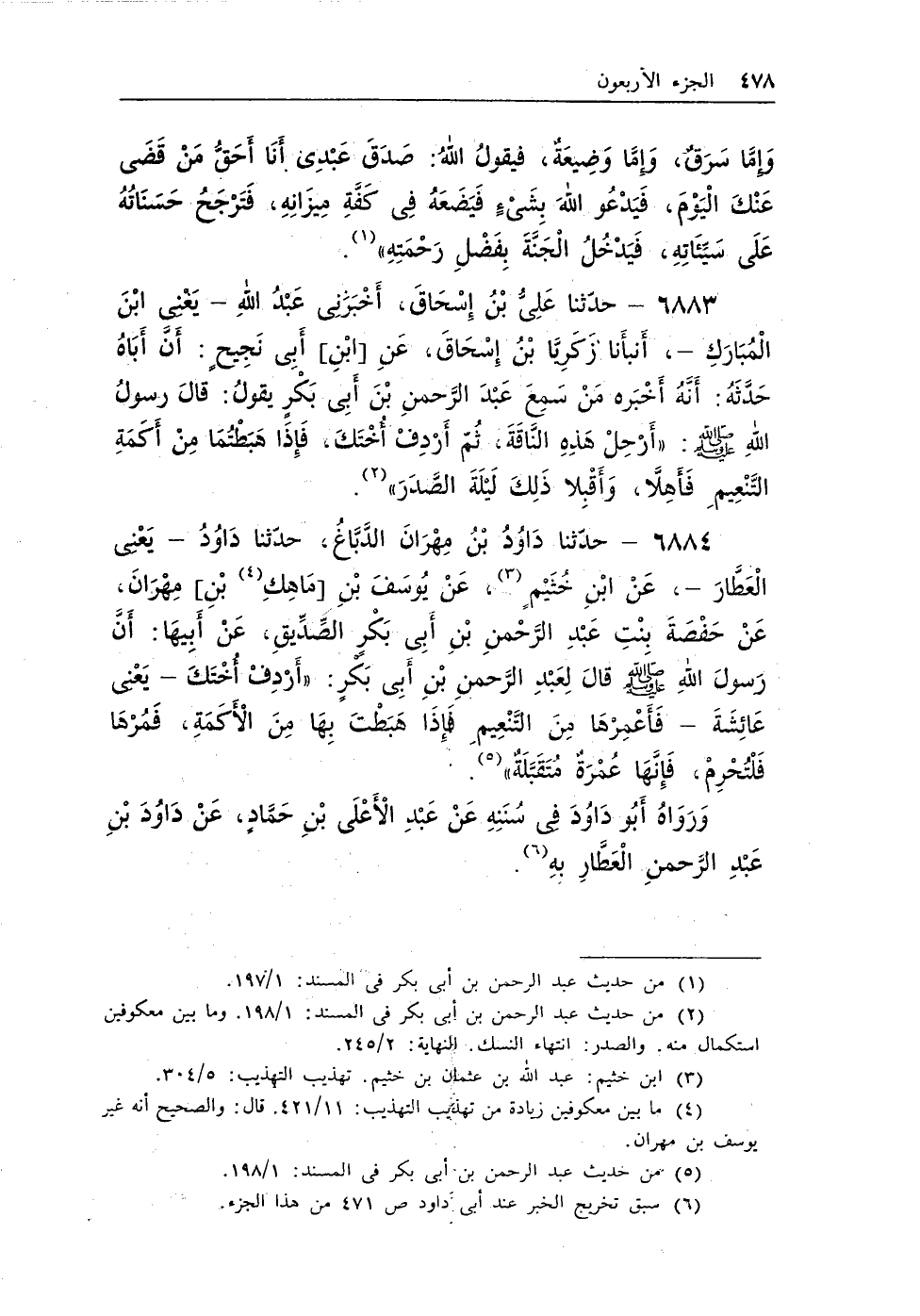 6883 - حدثنا على بن إسحاق، أخبرنى عبد الله ـ يعنى ابن المبارك ـ، أنبأنا زكريا بن إسحاق، عن [ابن] أبى نجيحٍ: أن أباه حدثه: أنه أخبره من سمع عبد الرحمن ابن أبى بكر يقول: قال رسول الله - صلى الله عليه وسلم -: «أَرْحِلْ هَذِهِ النَّاقَةَ، ثُمّ أَرْدِفْ أُخْتَكَ، فَإِذَا هَبَطْتُمَا مِنْ أَكَمَةِ التَّنْعِيمِ فَأَهِلاَّ، وَأَقْبِلا ذَلِكَ لَيْلَةَ الصَّدَرَ» (¬1) .