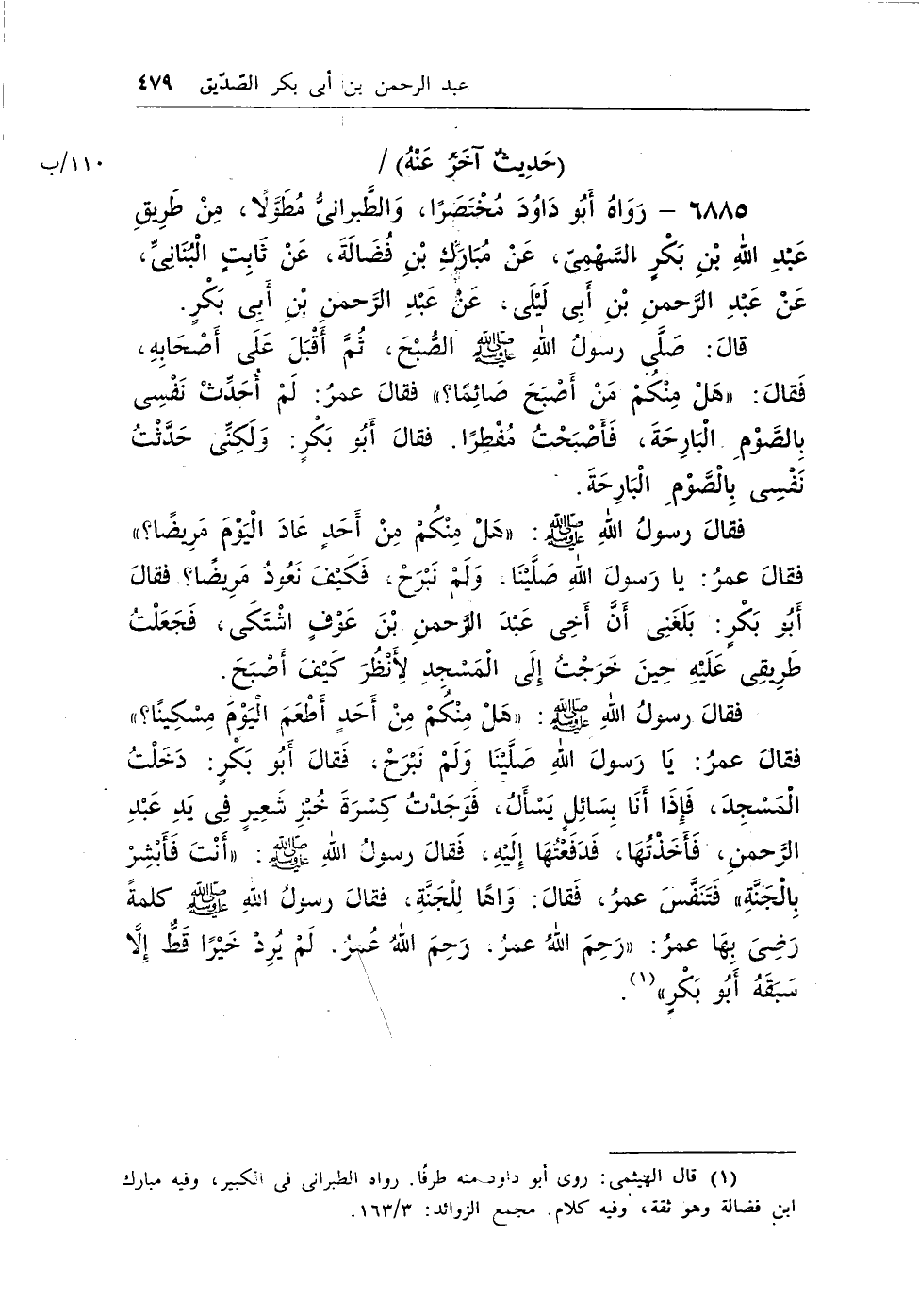 6685 - رواه أبو داود مختصرًا، والطبرانى مطولاً، من طريق عبد الله بن بكر السهمى، عن مبارك بن فضالة، عن ثابت البنانى، عن عبد الرحمن بن أبى ليلى، عن عبد الرحمن بن أبى بكر.